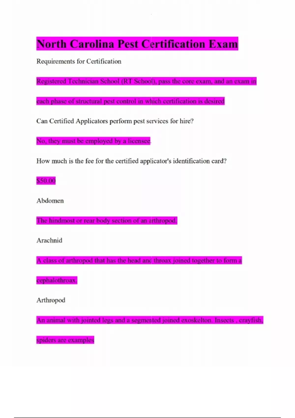 North Carolina Pest Certification Exam Requirements for Certification Registered Technician School (RT School), pass the core exam, and an exam in each phase of structural pest control in which certification is desired Can Certified Applicators perform pest services for hire? No, they must be employed by a licensee. How much is the fee for the certified applicator's identification card? $50.00 Abdomen The hindmost or rear body section of an arthropod. Arachnid A class of arthropod that has the head and throax joined together to form a cephalothroax. Arthropod An animal with jointed legs and a segmented joined exoskelton. Insects , crayfish, spiders are examplesCephalothroax The front body region of an arachnid. A cephalothorax is a combination of the head and thorax. A spider's eyes, mouthparts, and legs are on the cephalothorax. Exoskelton The hard, flexible outer covering of an arthropod Head The region of an insect where the eyes, antenne, and mouthparts are found Insect An arthropod with three body regions, six legs, and winged adults. Instar The insect as it appears between molts Larva An immature stage in the life cycle of an insect with complete metaphorphosis. In complete metamorphosis, the larval stage occurs between the egg and pupa stage. MetamorphosisThe change in body form during the life cycle. Some organims hatch looking like small adults. Others change as they develop