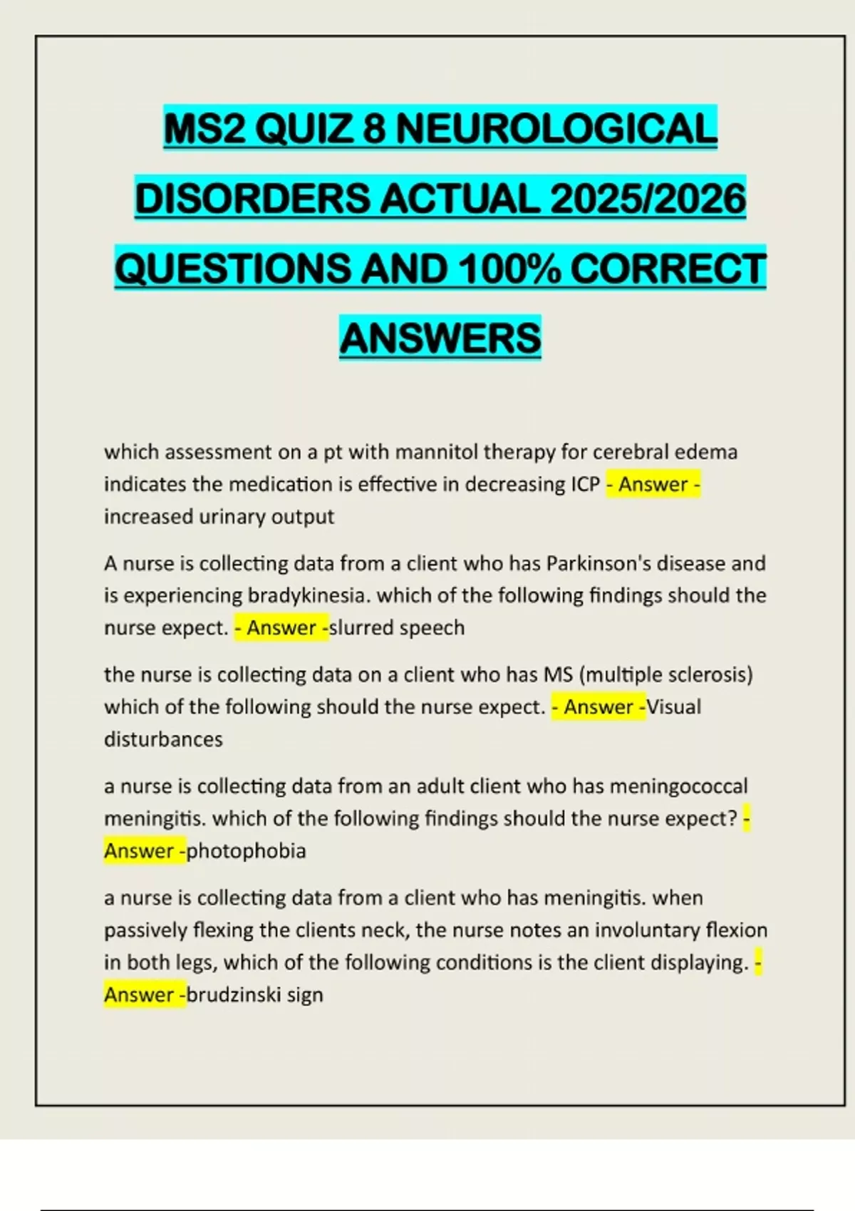 MS2 QUIZ 8 NEUROLOGICAL DISORDERS ACTUAL 2025/2026 QUESTIONS AND 100% CORRECT ANSWERS
