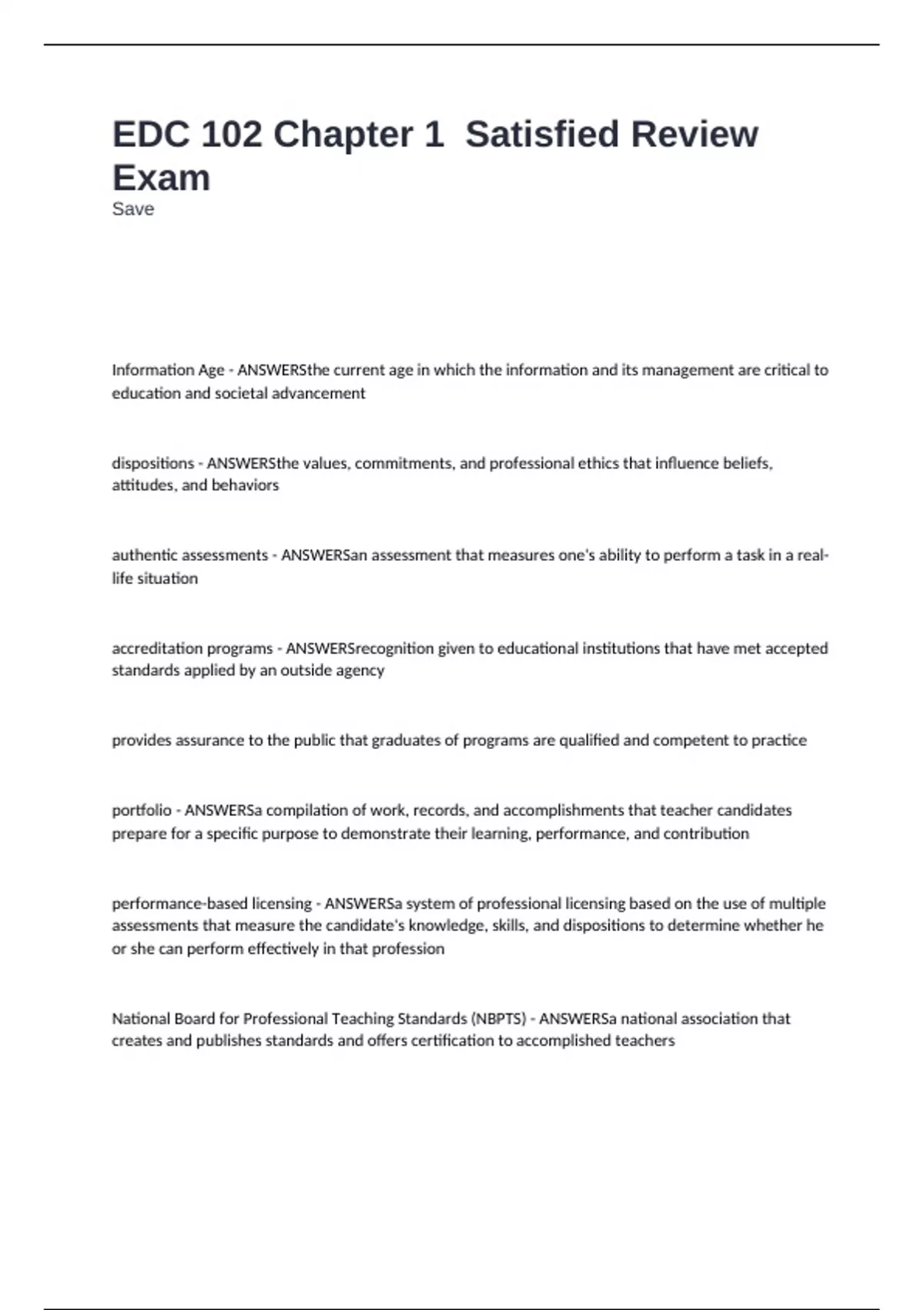 Information Age - ANSWERSthe current age in which the information and its management are critical to education and societal advancement dispositions - ANSWERSthe values, commitments, and professional ethics that influence beliefs, attitudes, and behaviors authentic assessments - ANSWERSan assessment that measures one's ability to perform a task in a real-life situation accreditation programs - ANSWERSrecognition given to educational institutions that have met accepted standards applied by an outside agency provides assurance to the public that graduates of programs are qualified and competent to practice portfolio - ANSWERSa compilation of work, records, and accomplishments that teacher candidates prepare for a specific purpose to demonstrate their learning, performance, and contribution performance-based licensing - ANSWERSa system of professional licensing based on the use of multiple assessments that measure the candidate's knowledge, skills, and dispositions to determine whether he or she can perform effectively in that profession National Board for Professional Teaching Standards (NBPTS) - ANSWERSa national association that creates and publishes standards and offers certification to accomplished teachers performance assessments - ANSWERSa comprehensive assessment system through which candidates demonstrate proficiencies in the area being measured salary schedule - ANSWERSA printed, negotiated schedule that lists salary levels based on years of experience and education induction - ANSWERSyears one to three of full-time teaching mentoring - ANSWERSAn experienced professional helping a less experienced colleague Number of public school teachers in the U.S. - ANSWERS3 Million Majority of American Public School teachers are - ANSWERSFemale Teachers usually leave the classroom for many reasons except - ANSWERSNumerous opportunities for upward mobility, not many for a people with a degree in Education What is AFT? - ANSWERSAmerican Federation of Teachers All are examples of accreditation unions except - ANSWERSAFT (teachers union) All of these are factors in the influence of the number of teachers needed annually except - ANSWERSSalary and benefit scales do not affect the number of teachers a district needs Number of private school teachers in the U.S. - ANSWERS400,000 Number of college and university professors and faculty in the U.S. - ANSWERS932,000 Percentage of teachers that work in the elementary school level - ANSWERS60% What are the four teacher shortages - ANSWERSESL, Bilingual, Special Education and Math and Science Teachers CAEP (Council for the Accreditation of Educator Preparation) - ANSWERSa major accrediting agency InTASC (Interstate New Teacher Assessment and Support Consortium) - ANSWERSten standards that mold teacher licensure and has been adopted by many states PRAXIS - ANSWERSa series of exams that are designed to assess the knowledge and skills required to be an effective educator at various stages of a beginning teacher's career NCLB (No Child Left Behind) - ANSWERSLegislation championed by George W. Bush which mandated sanctions against schools that failed to meet federal performance standards; part of his campaign pledge to end "low expectations". ESSA (Every Student Succeeds Act) - ANSWERSReplaced no child left behind act Was put into place during Obama's presidency expresses broad, national goals, and guides much of the federal funding of educational activity through the nation PLT (Principles of Learning and Teaching Test) - ANSWERSmeasures your pedagogical knowledge for the level that you plan to teach
