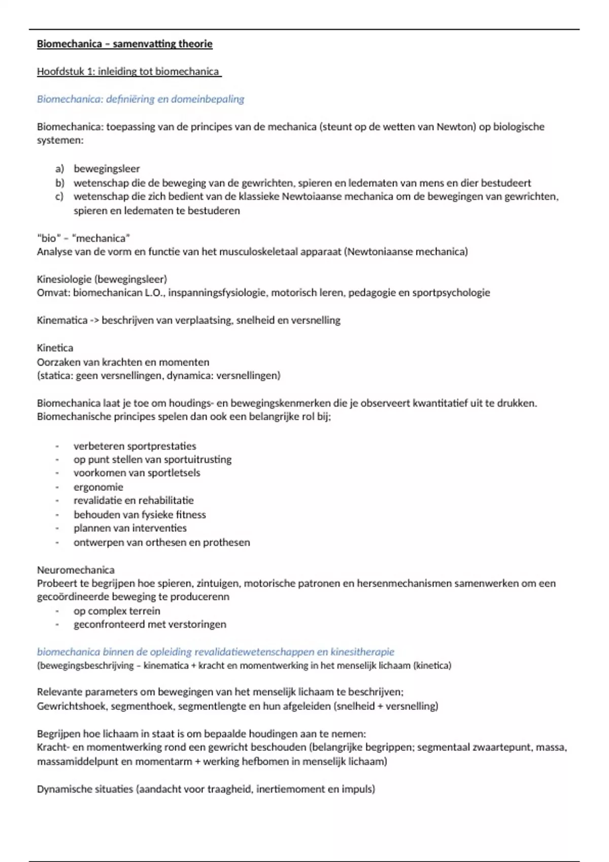 Grondige samenvatting van het vak biomechanica REVAKI (eerste jaar) De samenvatting is op basis van het boek, hoorcolleges en de powerpoints.
