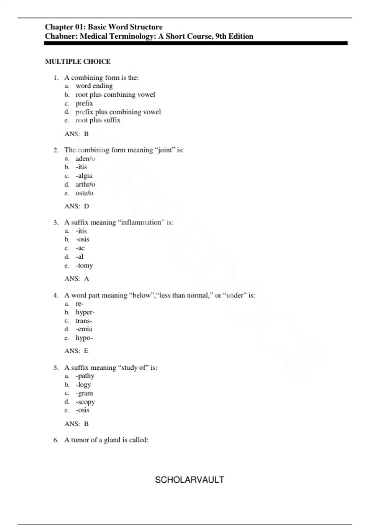 4. A word part meaning “below”,“less than normal,” or “under” is: