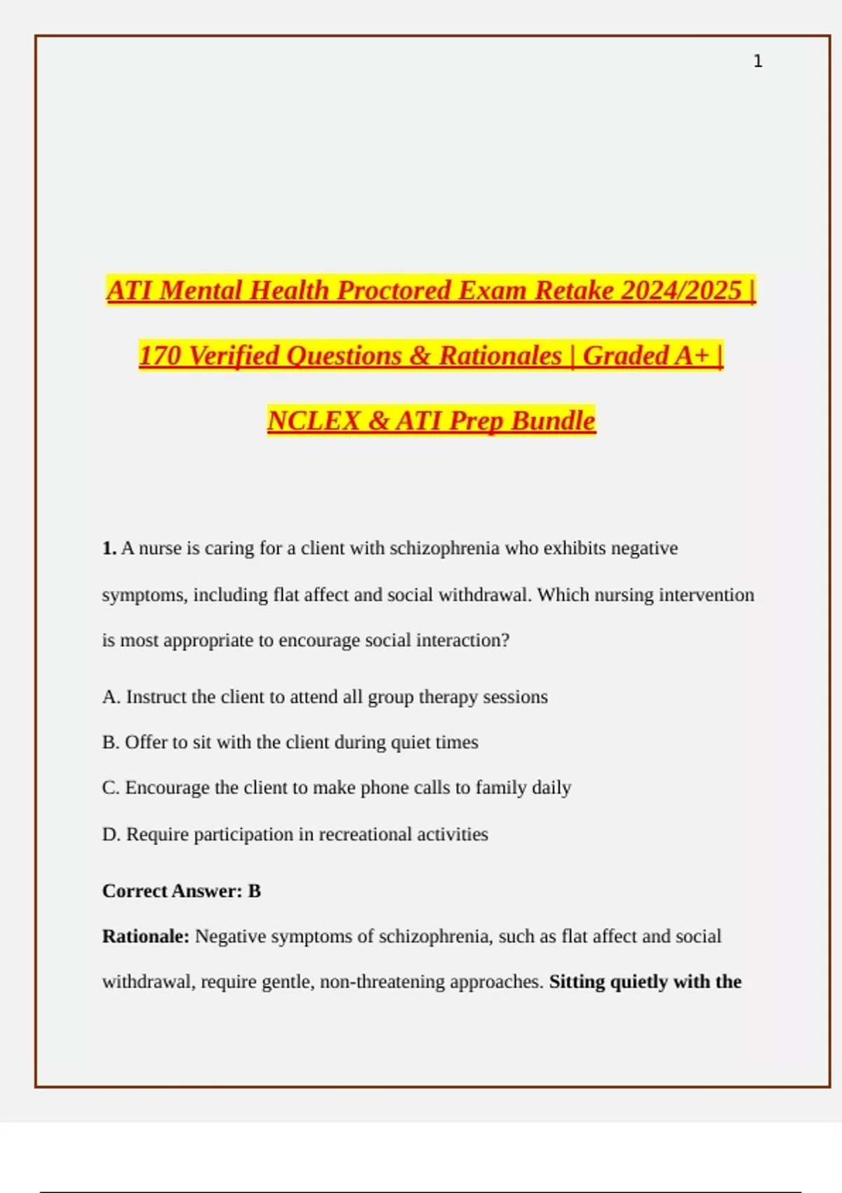 Get the ATI Mental Health Proctored Exam – Retake Version (2024/2025) with 170 Verified, Updated, and Correct Questions designed to reflect the actual ATI exam format. This complete mental health test bank features super detailed NCLEX-style questions and rationales, including therapeutic communication, psych disorders, crisis intervention, pharmacology (SSRIs, antipsychotics, mood stabilizers), legal/ethical scenarios, and Next Gen-style prioritization. Ideal for ATI, NCLEX, and HESI prep, this guide ensures you're ready to pass on the first try. All content is graded A+, real exam-level, and covers the latest blueprint. Perfect for nursing students aiming for an A+ and guaranteed pass.