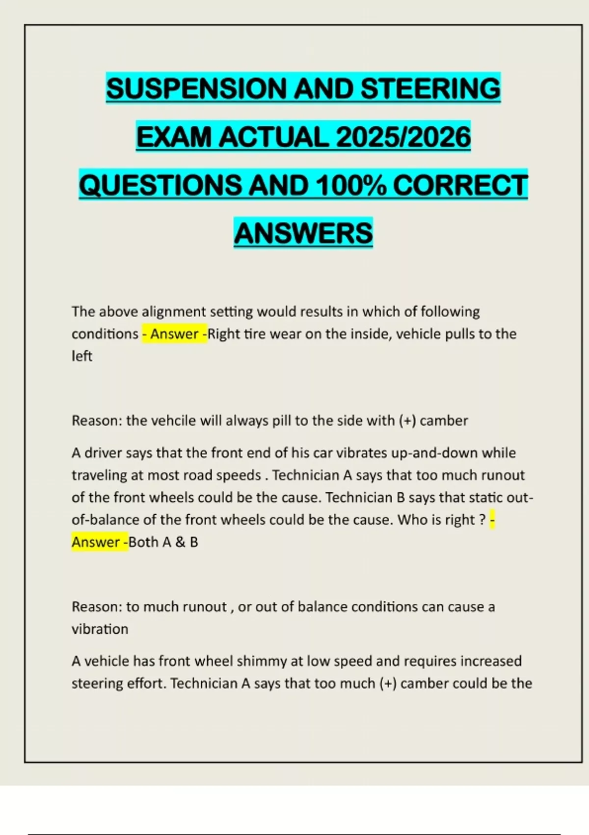 SUSPENSION AND STEERING EXAM ACTUAL 2025/2026 QUESTIONS AND 100% CORRECT ANSWERS The above alignment setting would results in which of following conditions - Answer -Right tire wear on the inside, vehicle pulls to the left Reason: the vehcile will always pill to the side with (+) camber A driver says that the front end of his car vibrates up-and-down while traveling at most road speeds . Technician A says that too much runout of the front wheels could be the cause. Technician B says that static outof-balance of the front wheels could be the cause. Who is right ? - Answer -Both A & B Reason: to much runout , or out of balance conditions can cause a vibration A vehicle has front wheel shimmy at low speed and requires increased steering effort. Technician A says that too much (+) camber could be thecause. Technician B says that too much (+) caster could be the cause. Who is right ? - Answer -Technician B only All of these could cause tire wear if not within manufacturer's specs EXPECT: - Answer -Caster A vehicle with variable assist power steering has a lack of power assist in both directions. Technician A says that the problem is in the electronic control system. Technician B says that there could be a problem in the steering gear or a bad power steering pump. Who is right? - Answer -Technician B A customer complains that a vehicle wanders on a bunny road and needs continual driver correction to stay straight . What could be wrong ? - Answer -•excessive negative from caster •insufficient front toe •rear on front bump steer While aligning a front end, a technician finds the toe-out on turns ( turning radius) to be greater than manufacturers spec and its has 2.0 degrees difference from the left side to the right side. Which, if any , of the following could be the cause ? - Answer -Both B& C •bent pitman arm •bent tie-rod Reason: toe-out on turns or SAI. If their out of spec means their something bent in front end . In this case , it might be bent pit-man arm or tie rodWhen checking a tire, a technician finds it to have too much radial (upand-down) runout. Technician A says to rotate the tire and wheel assembly on the mounting studs to correct the problem. Technician B says to rotate the tire on the wheel assembly to attempt to bring the runout within specifications. Who is right? - Answer -Technician B only Reason: to fix tire runout. It's possible to rotate the tire on the rim to compensate for high & low spots If you readjust camber on the left front