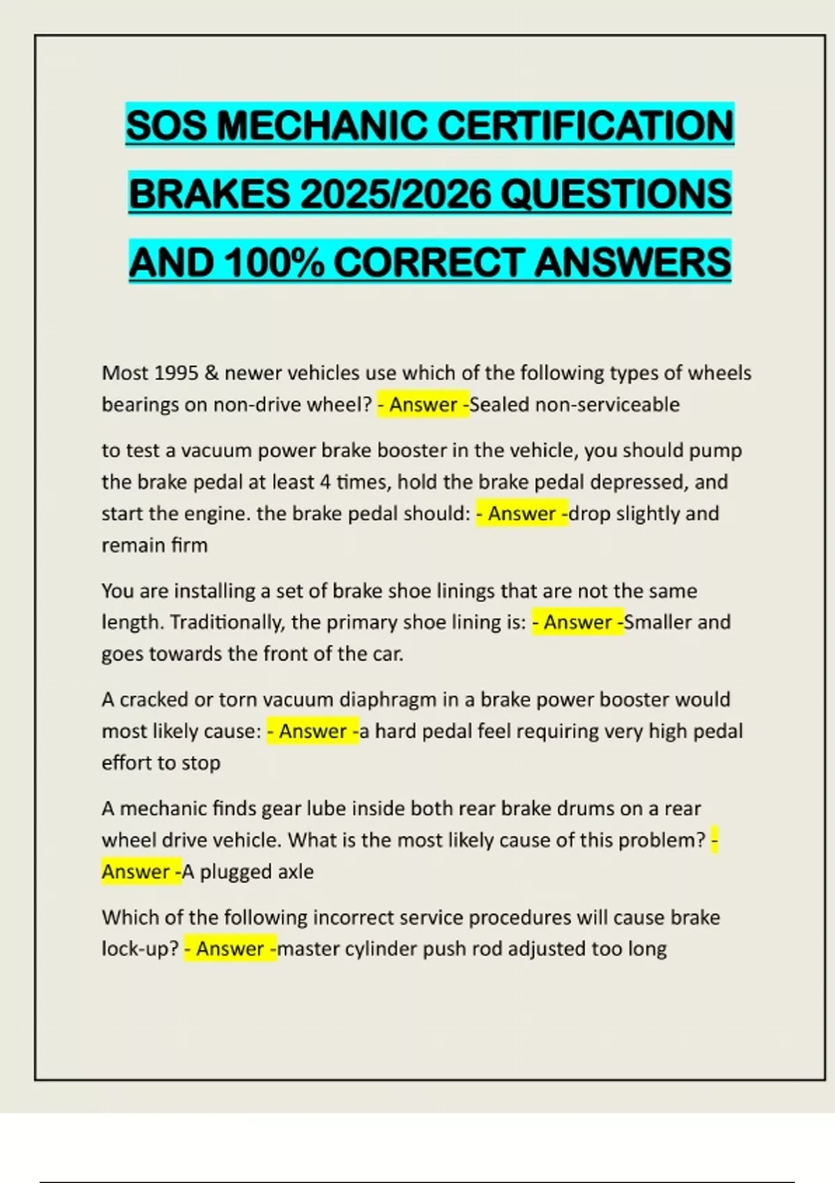 SOS MECHANIC CERTIFICATION BRAKES 2025/2026 QUESTIONS AND 100% CORRECT ANSWERS Most 1995 & newer vehicles use which of the following types of wheels bearings on non-drive wheel? - Answer -Sealed non-serviceable to test a vacuum power brake booster in the vehicle, you should pump the brake pedal at least 4 times, hold the brake pedal depressed, and start the engine. the brake pedal should: - Answer -drop slightly and remain firm You are installing a set of brake shoe linings that are not the same length. Traditionally, the primary shoe lining is: - Answer -Smaller and goes towards the front of the car. A cracked or torn vacuum diaphragm in a brake power booster would most likely cause: - Answer -a hard pedal feel requiring very high pedal effort to stop A mechanic finds gear lube inside both rear brake drums on a rear wheel drive vehicle. What is the most likely cause of this problem? - Answer -A plugged axle Which of the following incorrect service procedures will cause brake lock-up? - Answer -master cylinder push rod adjusted too longWhich of the following describes the proper way to depressurized an ABS system? - Answer -Pump the brake pedal at least 25 times (or more, depending on the manufacturer's recommendation) with the ignition off. The rear brakes are dragging after having new linings installed and the drums machined. the most likely cause is the: - Answer -technician use the parking brake to adjust shoes and the cable is stuck When turning brake drums: - Answer -use a dampening strap to reduce chatter Which of the following is NOT a necessary drum brake measurement? - Answer -run-out On a 3-channel system, which wheels are on the same circuit? - Answer -both rear wheels One way to test an ABS wheel speed signal is to use _____ on your digital multimeter. - Answer -AC volts The key input for the ABS control module comes from t