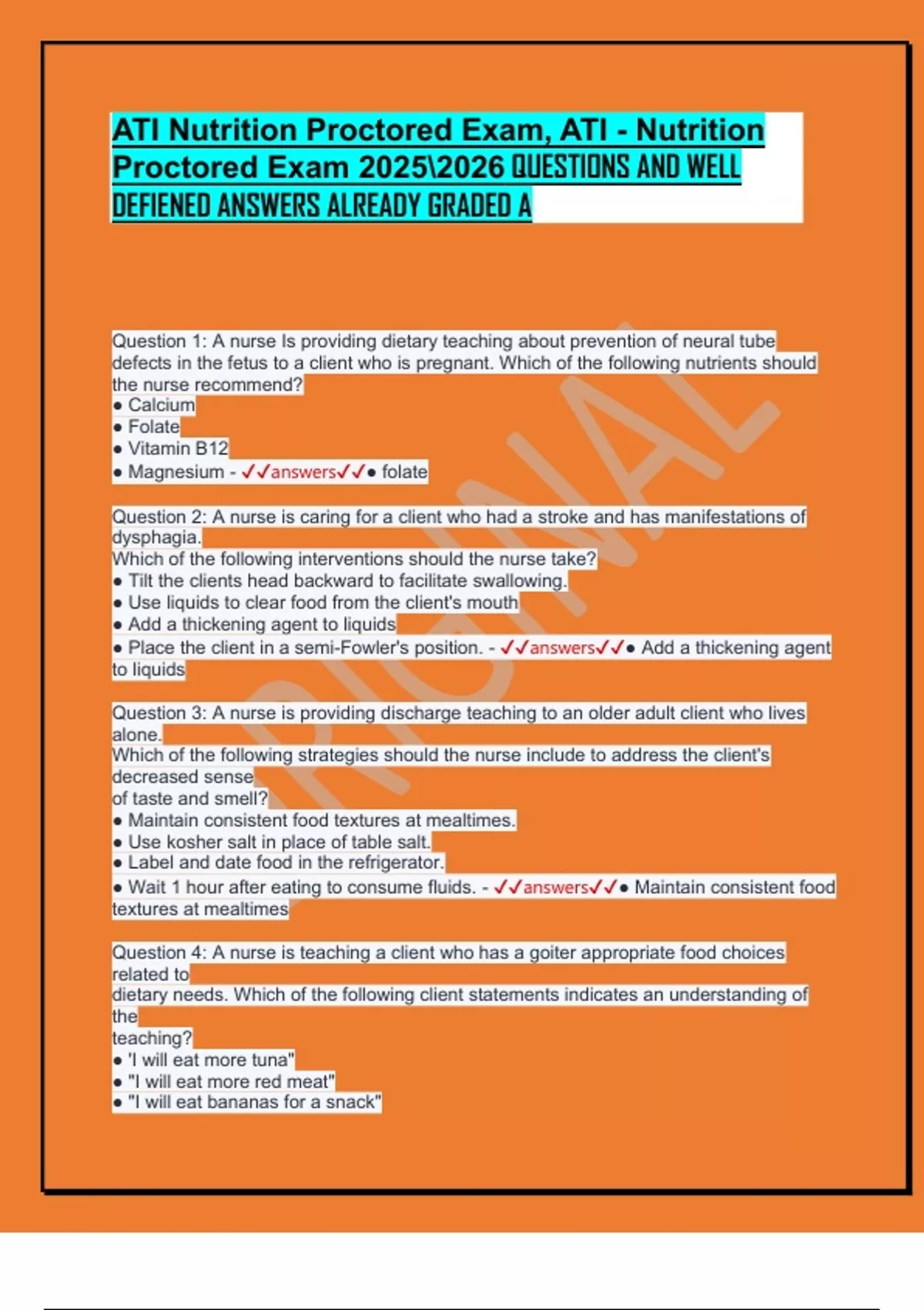 ATI Nutrition Proctored Exam, ATI - Nutrition Proctored Exam QUESTIONS AND WELL DEFIENED ANSWERS ALREADY GRADED A Question 1: A nurse Is providing dietary teaching about prevention of neural tube defects in the fetus to a client who i