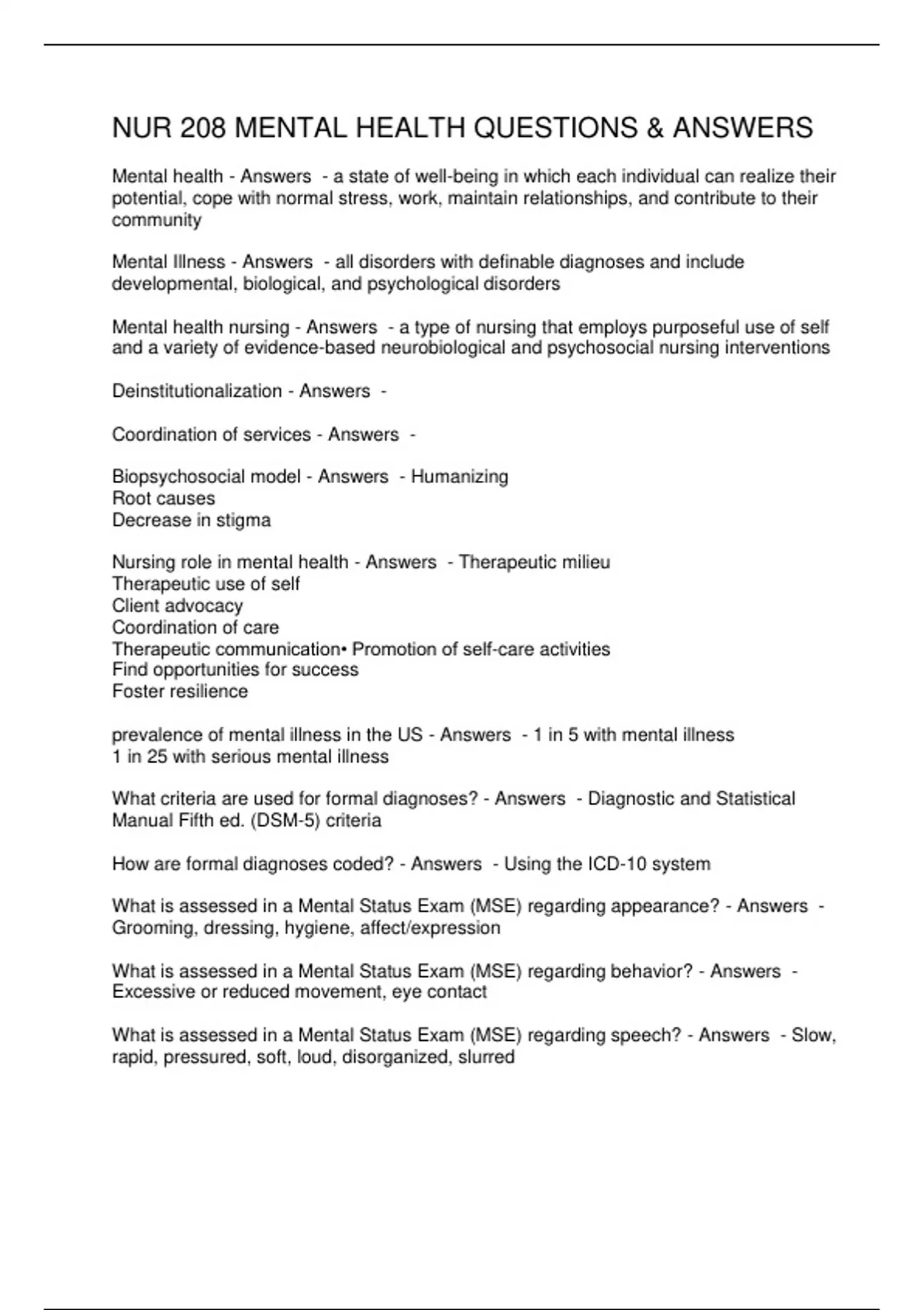 NUR 208 MENTAL HEALTH QUESTIONS & ANSWERS
