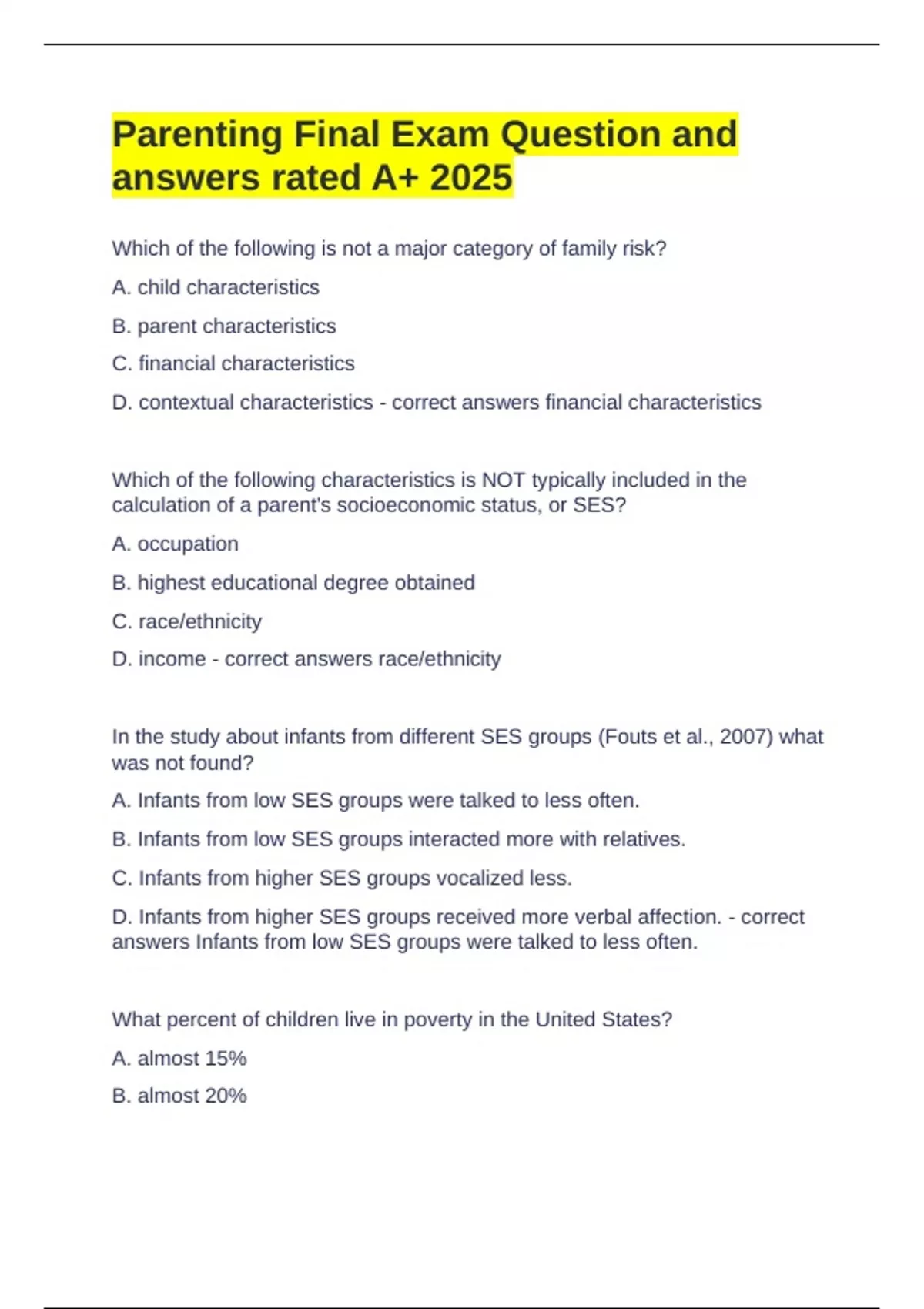 Parenting Final Exam Question and answers rated A+ 2025 Which of the following is not a major category of family risk? A. child characteristics B. parent characteristics C. financial characteristics D. contextual characteristics - correct answers financial characteristics Which of the following characteristics is NOT typically included in the calculation of a parent's socioeconomic status, or SES? A. occupation B. highest educational degree obtained C. race/ethnicity D. income - correct answers race/ethnicity In the study about infants from different SES groups (Fouts et al., 2007) what was not found? A. Infants from low SES groups were talked to less often. B. Infants from low SES groups interacted more with relatives. C. Infants from higher SES groups vocalized less. D. Infants from higher SES groups received more verbal affection. - correct answers Infants from low SES groups were talked to less often. What percent of children live in poverty in the United States? A. almost 15% B. almost 20% C. almost 25%