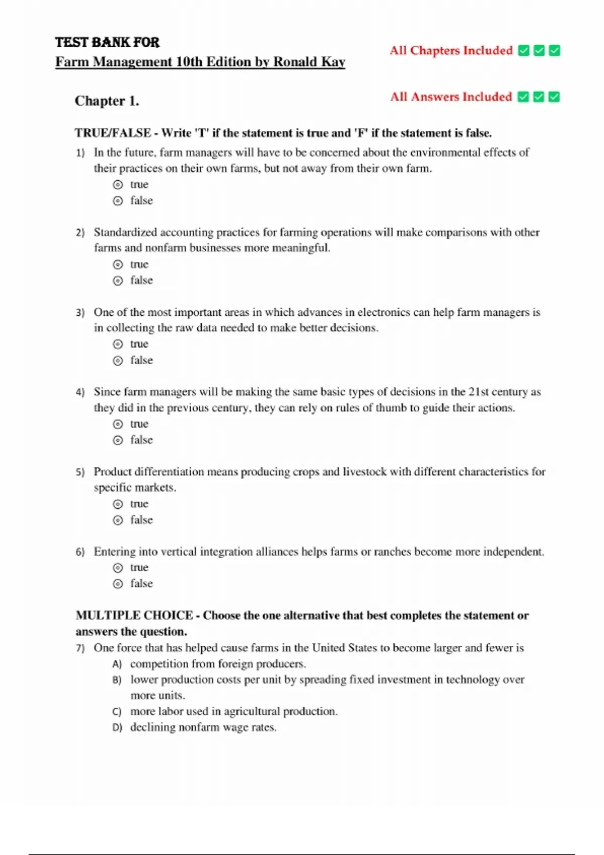 Test Bank for Farm Management 10th Edition (Chapter 1 to 22) by Ronald Kay, William Edwards |All Chapters