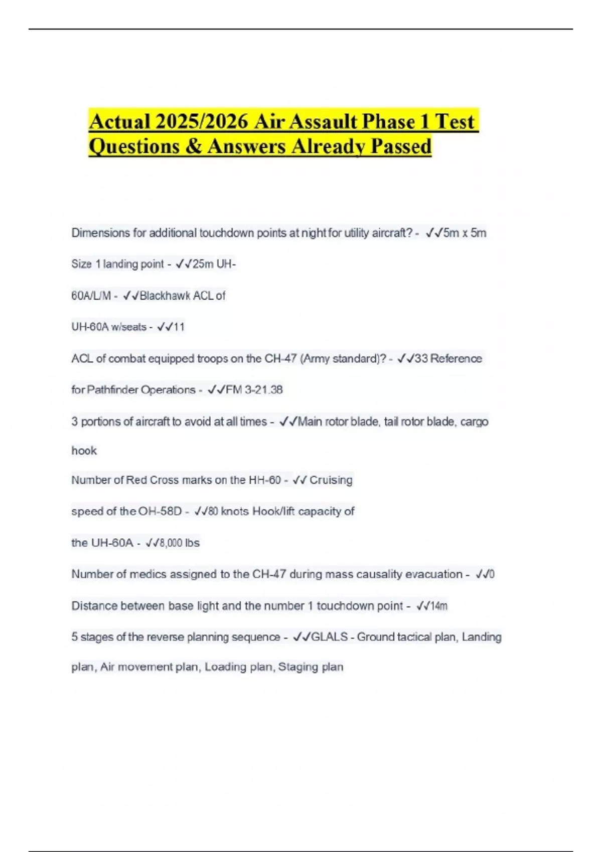 Actual 2025/2026 Air Assault Phase 1 Test Questions & Answers Already Passed Dimensions for additional touchdown points at night for utility aircraft? - ️️5m x 5m Size 1 landing point - ️️25m UH- 60A/L/M - ️️Blackhawk ACL of UH-60A w/seats - ️️11 ACL of combat equipped troops on the CH-47 (Army standard)? - ️️33 Reference for Pathfinder Operations - ️️FM 3-21.38 3 portions of aircraft to avoid at all times - ️️Main rotor blade, tail rotor blade, cargo hook Number of Red Cross marks on the HH-60 - ️️ Cruising speed of the OH-58D - ️️80 knots Hook/lift capacity of the UH-60A - ️️8,000 lbs Number of medics assigned to the CH-47 during mass causality evacuation - ️️0 Distance between base light and the number 1 touchdown point - ️️14m 5 stages of the reverse planning sequence - ️️GLALS - Ground tactical plan, Landing plan, Air movement plan, Loading plan, Staging plan