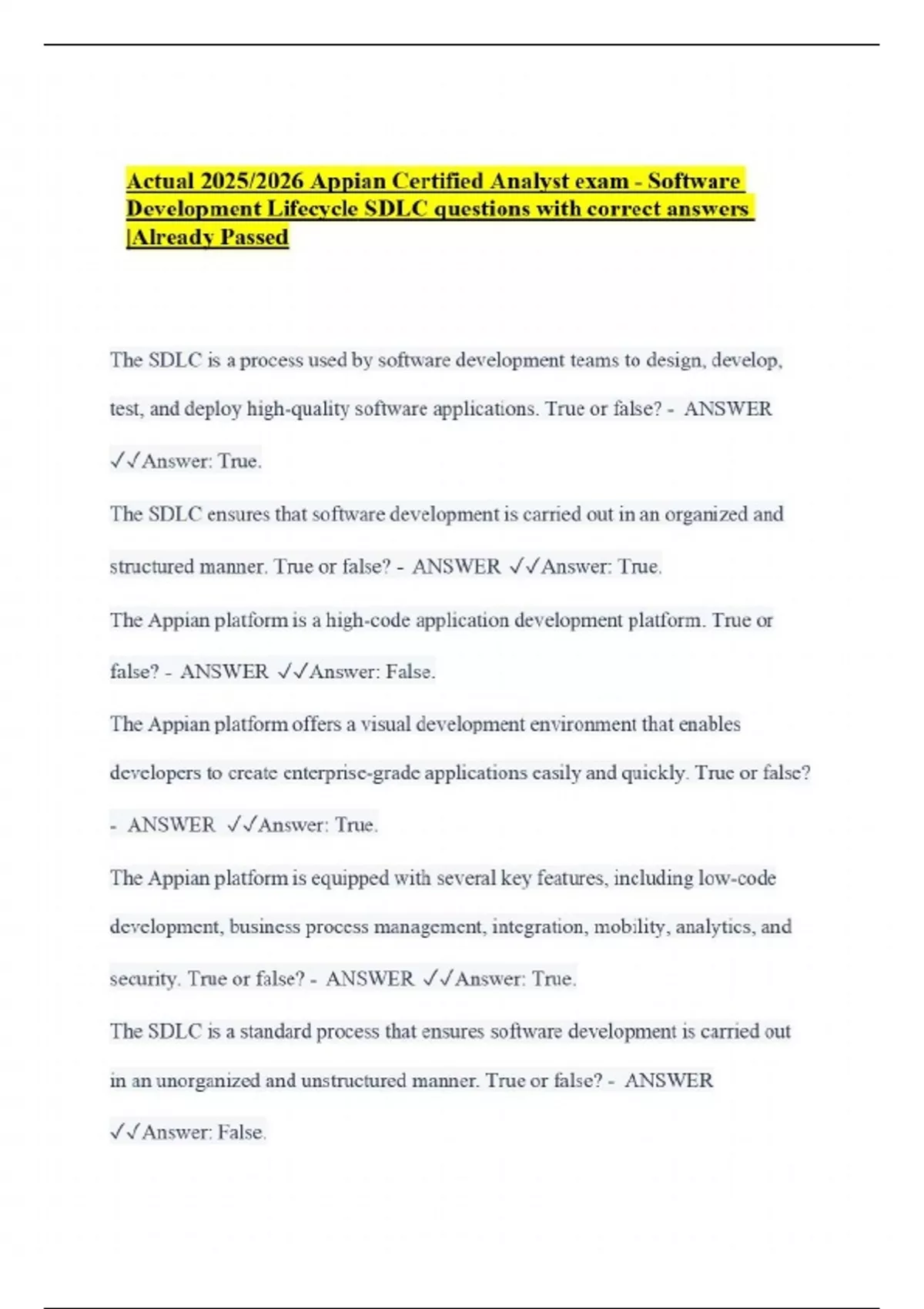 Actual 2025/2026 Appian Certified Analyst exam - Software Development Lifecycle SDLC questions with correct answers |Already Passed The SDLC is a process used by software development teams to design, develop, test, and deploy high-quality software applications. True or false? - ANSWER Answer: True. The SDLC ensures that software development is carried out in an organized and structured manner. True or false? - ANSWER Answer: True. The Appian platform is a high-code application development platform. True or false? - ANSWER Answer: False. The Appian platform offers a visual development environment that enables developers to create enterprise-grade applications easily and quickly. True or false? - ANSWER Answer: True. The Appian platform is equipped with several key features, including low-code development, business process management, integration, mobility, analytics, and security. True or false? - ANSWER Answer: True. The SDLC is a standard process that ensures software development is carried out in an unorganized and unstructured manner. True or false? - ANSWER Answer: False.