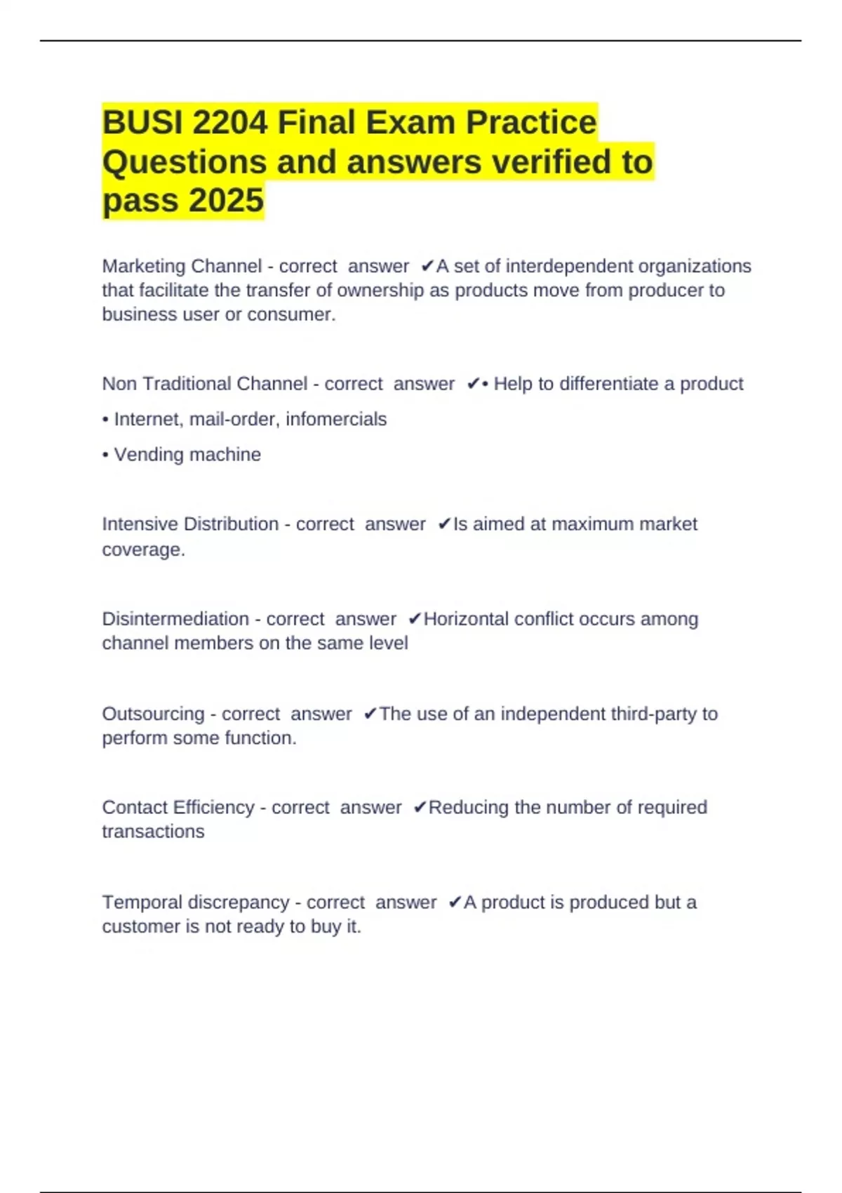 BUSI 2204 Final Exam Practice Questions and answers verified to pass 2025 Marketing Channel - correct answer A set of interdependent organizations that facilitate the transfer of ownership as products move from producer to business user or consumer. Non Traditional Channel - correct answer • Help to differentiate a product • Internet, mail-order, infomercials • Vending machine Intensive Distribution - correct answer Is aimed at maximum market coverage. Disintermediation - correct answer Horizontal conflict occurs among channel members on the same level Outsourcing - correct answer The use of an independent third-party to perform some function. Contact Efficiency - correct answer Reducing the number of required transactions Temporal discrepancy - correct answer A product is produced but a customer is not ready to buy it.