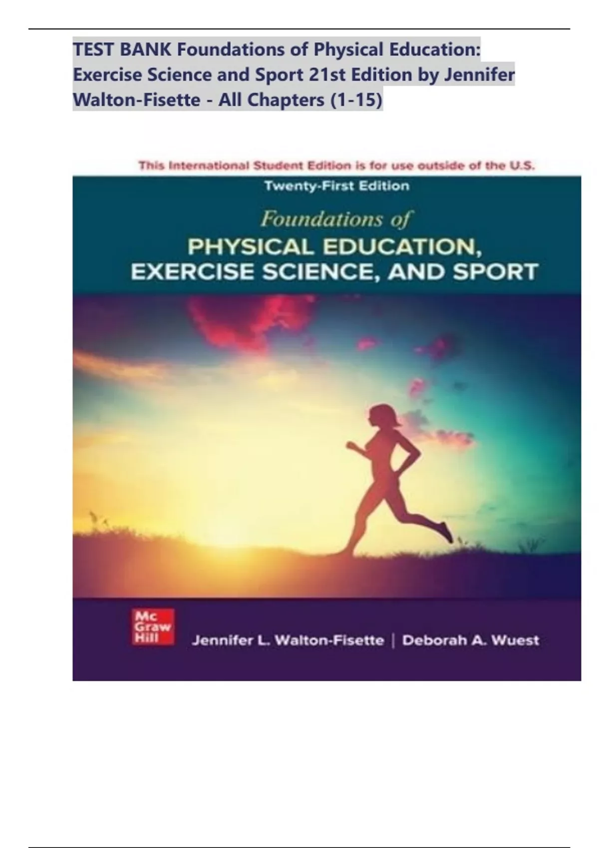 **Comprehensive Test Bank for Physical Education and Exercise Science** Prepare your students for success in physical education and exercise science with the 21st Edition of Foundations of Physical Education: Exercise Science and Sport Test Bank. Authored by renowned experts Jennifer Walton-Fisette and Deborah Wuest, this trusted resource provides instructors with a wealth of assessment materials to gauge student understanding and progress. This test bank includes a diverse range of questions, from multiple-choice and true/false to short-answer and essay questions, covering key topics in physical education, exercise science, and sport. The questions are carefully crafted to align with the learning objectives of the Foundations of Physical Education: Exercise Science and Sport textbook, ensuring a seamless integration into your teaching curriculum. With this test bank, you'll have the tools to: * Assess student knowledge of physical education concepts, theories, and principles * Evaluate student understanding of exercise science and sport-related topics * Identify areas where students may need additional support or review * Create customized quizzes and exams tailored to your teaching style and course goals The 21st Edition of the Foundations of Physical Education: Exercise Science and Sport Test Bank is an indispensable resource for instructors seeking to promote student learning, engagement, and success in physical education and exercise science courses. **INSTANT ACCESS PDF DOWNLOAD!!** PDF
