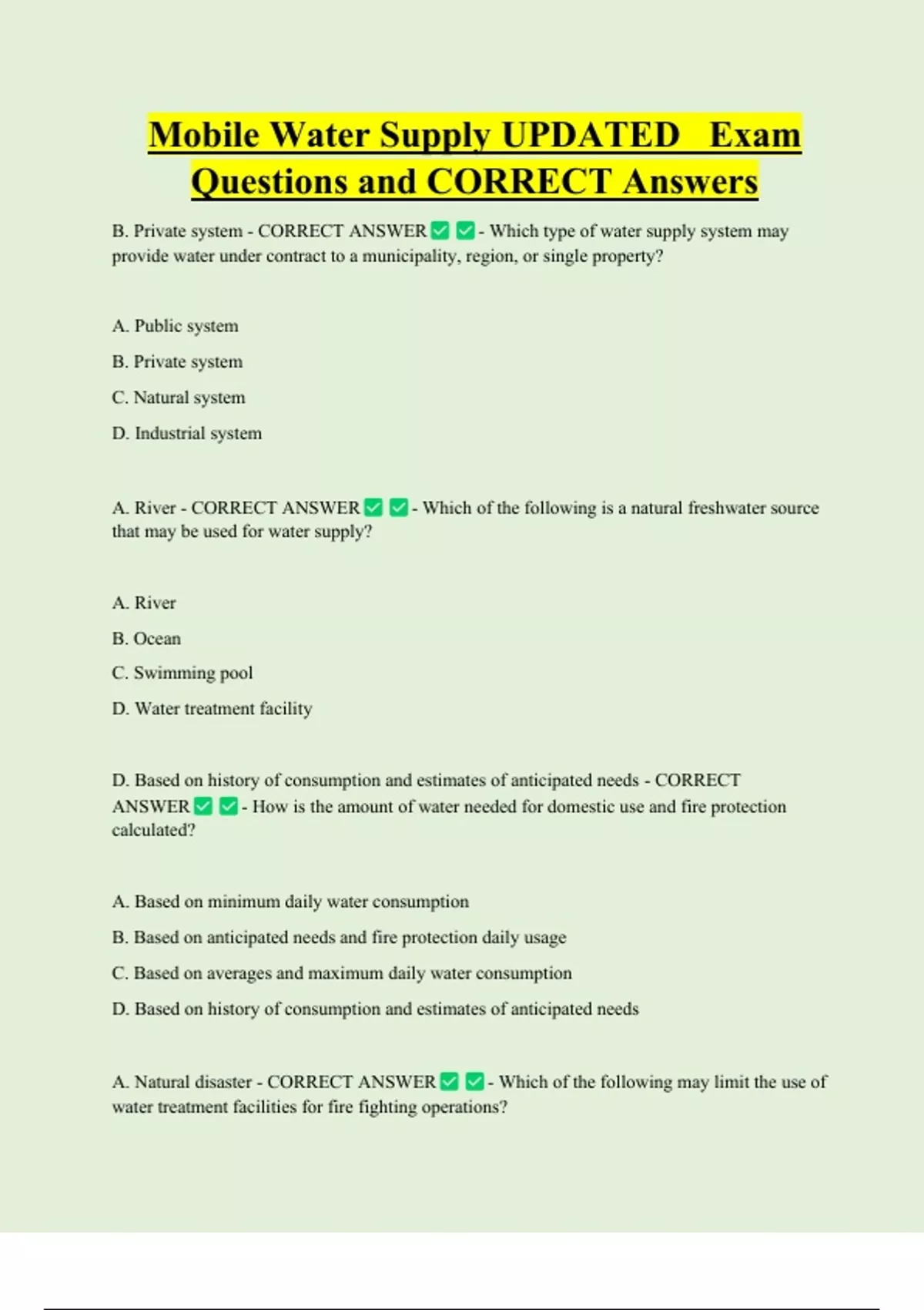 Mobile Water Supply UPDATED Exam Questions and CORRECT Answers B. Private system - CORRECT ANSWER - Which type of water supply system may provide water under contract to a municipality, region, or single property? A. Public system B. Private system C. Natural system D. Industrial system A. River - CORRECT ANSWER that may be used for water supply? A. River B. Ocean C. Swimming pool D. Water treatment facility - Which of the following is a natural freshwater sour
