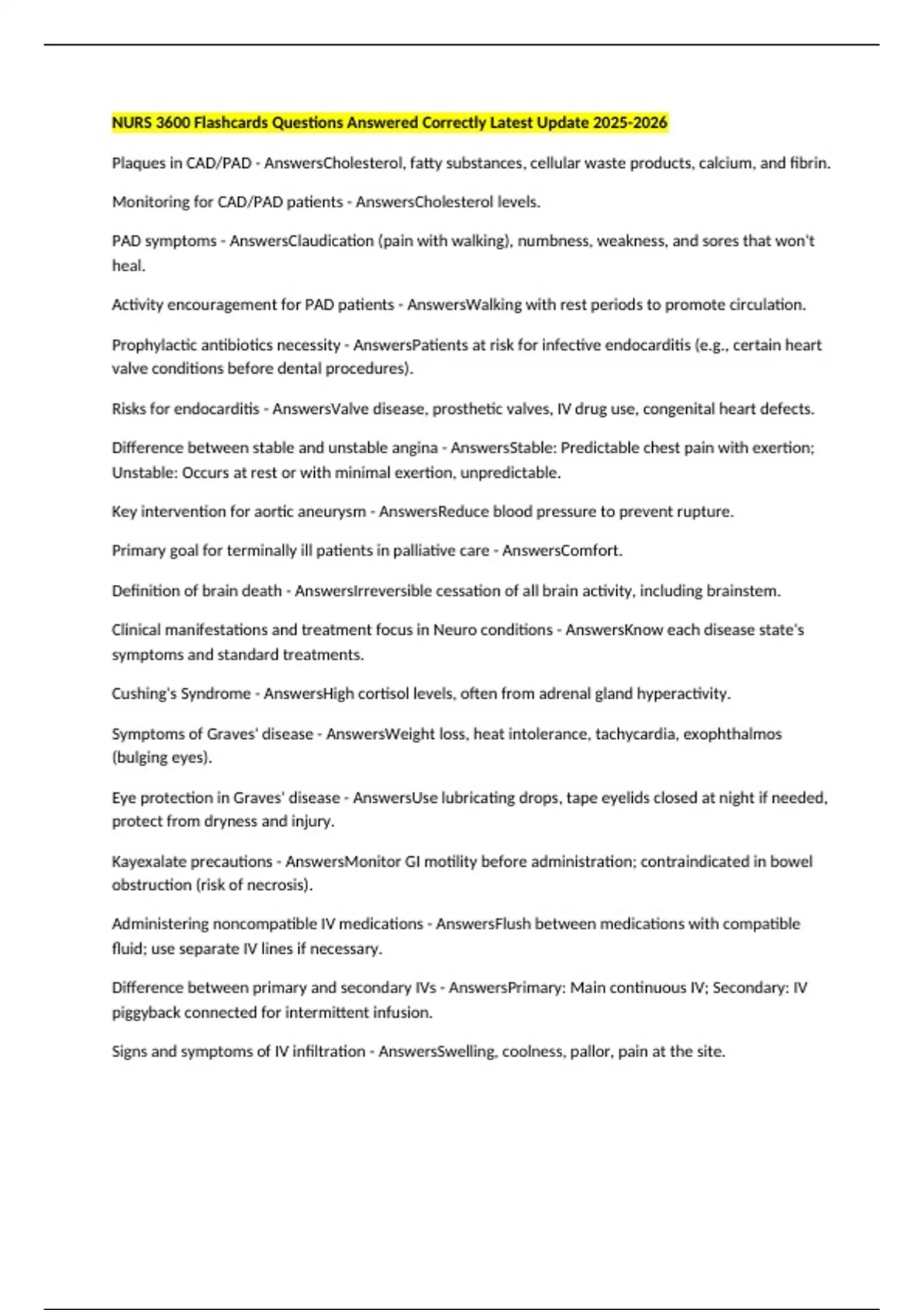 NURS 3600 Flashcards Questions Answered Correctly Latest Update Plaques in CAD/PAD - AnswersCholesterol, fatty substances, cellular waste products, calcium, and fibrin. Monitoring for CAD/PAD patients - AnswersCholesterol levels. PAD symptoms - AnswersClaudication (pain with walking), numbness, weakness, and sores that won't heal. Activity encouragement for PAD patients - AnswersWalking with rest periods to promote circulation. Prophylactic antibiotics necessity - AnswersPatients at risk for infective endocarditis (e.g., certain heart valve conditions before dental procedures). Risks for endocarditis - AnswersValve disease, prosthetic valves, IV drug use, congenital heart defects. Difference between stable and unstable angina - AnswersStable: Predictable chest pain with exertion; Unstable: Occurs at rest or with minimal exertion, unpredictable. Key intervention for aortic aneurysm - AnswersReduce blood pressure to prevent rupture. Primary goal for terminally ill patients in palliative care - AnswersComfort. Definition of brain death - AnswersIrreversible cessation of all brain activity, including brainstem. Clinical manifestations and treatment focus in Neuro conditions - AnswersKnow each disease state's symptoms and standard treatments. Cushing's Syndrome - AnswersHigh cortisol levels, often from adrenal gland hyperactivity. Symptoms of Graves' disease - AnswersWeight loss, heat intolerance, tachycardia, exophthalmos (bulging eyes). Eye protection in Graves' disease - AnswersUse lubricating drops, tape eyelids closed at night if needed, protect from dryness and injury. Kayexalate precautions - AnswersMonitor GI motility before administration; contraindicated in bowel obstruction (risk of necrosis). Administering noncompatible IV medications - AnswersFlush between medications with compatible fluid; use separate IV lines if necessary. Difference between primary and secondary IVs - AnswersPrimary: Main continuous IV; Secondary: IV piggyback connected for intermittent infusion. Signs and symptoms of IV infiltration - AnswersSwelling, coolness, pallor, pain at the site. Key steps in tracheal suctioning - AnswersInsert until resistance, elicit cough, suction intermittently while withdrawing, hyperoxygenate before and after, maintain sterility. Purpose of chest tubes - AnswersRemove air, blood, or fluid from pleural space to re-expand lungs. Normal WBC range - Answers4,000-11,000/mm³. Normal Platelet count - Answers150,000-450,000/mm³. Normal Neutrophil percentage - Answers40-60% of WBCs. Normal BUN - Answers7-20 mg/dL. Normal Creatinine - Answers0.6-1.2 mg/dL. Normal GFR - Answers>90 mL/min.