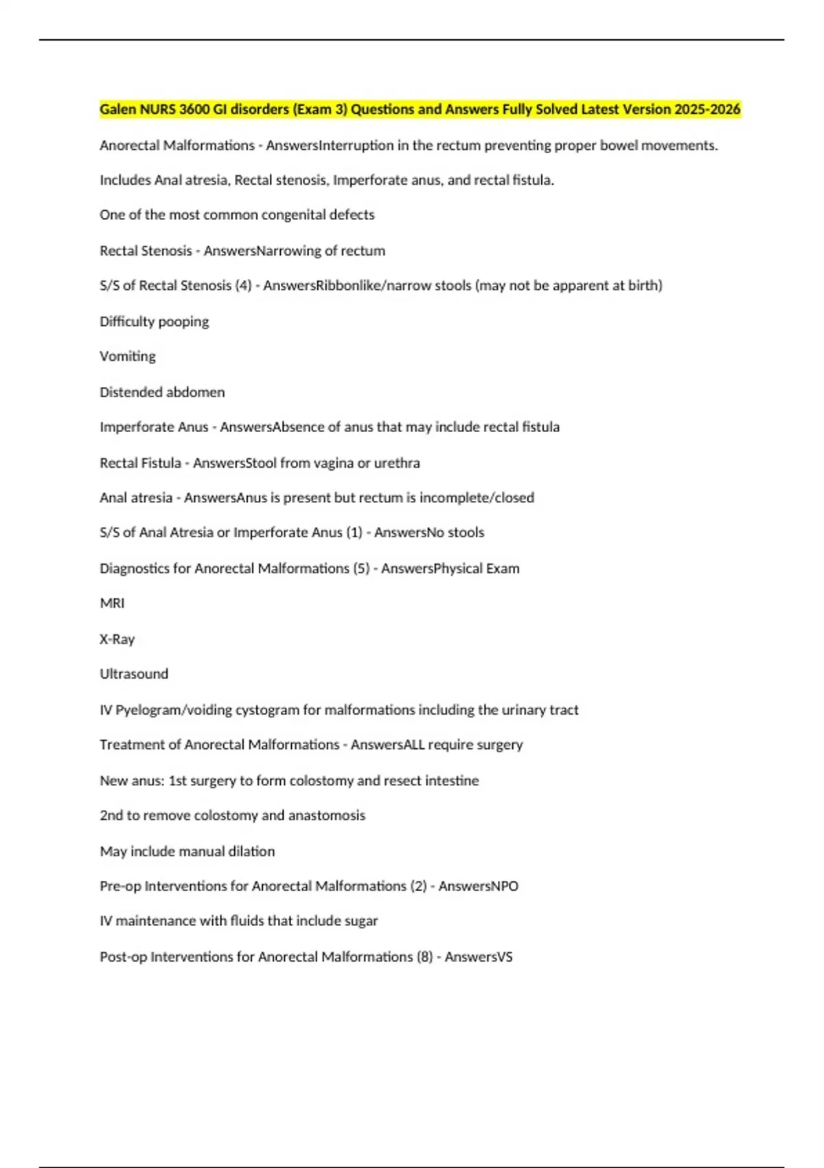 Galen NURS 3600 GI disorders (Exam 3) Questions and Answers Fully Solved Latest Version Anorectal Malformations - AnswersInterruption in the rectum preventing proper bowel movements. Includes Anal atresia, Rectal stenosis, Imperforate anus, and rectal fistula. One of the most common congenital defects Rectal Stenosis - AnswersNarrowing of rectum S/S of Rectal Stenosis (4) - AnswersRibbonlike/narrow stools (may not be apparent at birth) Difficulty pooping Vomiting Distended abdomen Imperforate Anus - AnswersAbsence of anus that may include rectal fistula Rectal Fistula - AnswersStool from vagina or urethra Anal atresia - AnswersAnus is present but rectum is incomplete/closed S/S of Anal Atresia or Imperforate Anus (1) - AnswersNo stools Diagnostics for Anorectal Malformations (5) - AnswersPhysical Exam MRI X-Ray Ultrasound IV Pyelogram/voiding cystogram for malformations including the urinary tract Treatment of Anorectal Malformations - AnswersALL require surgery New anus: 1st surgery to form colostomy and resect intestine 2nd to remove colostomy and anastomosis May include manual dilation Pre-op Interventions for Anorectal Malformations (2) - AnswersNPO IV maintenance with fluids that include sugar Post-op Interventions for Anorectal Malformations (8) - AnswersVS I&O pain management infection control skin care monitor stools NG decompression PO feedings after bowel sounds become present Education for Anorectal Malformations (7) - AnswersColostomy care Manual anal dilation instructions Dietary fiber Maintain fluids