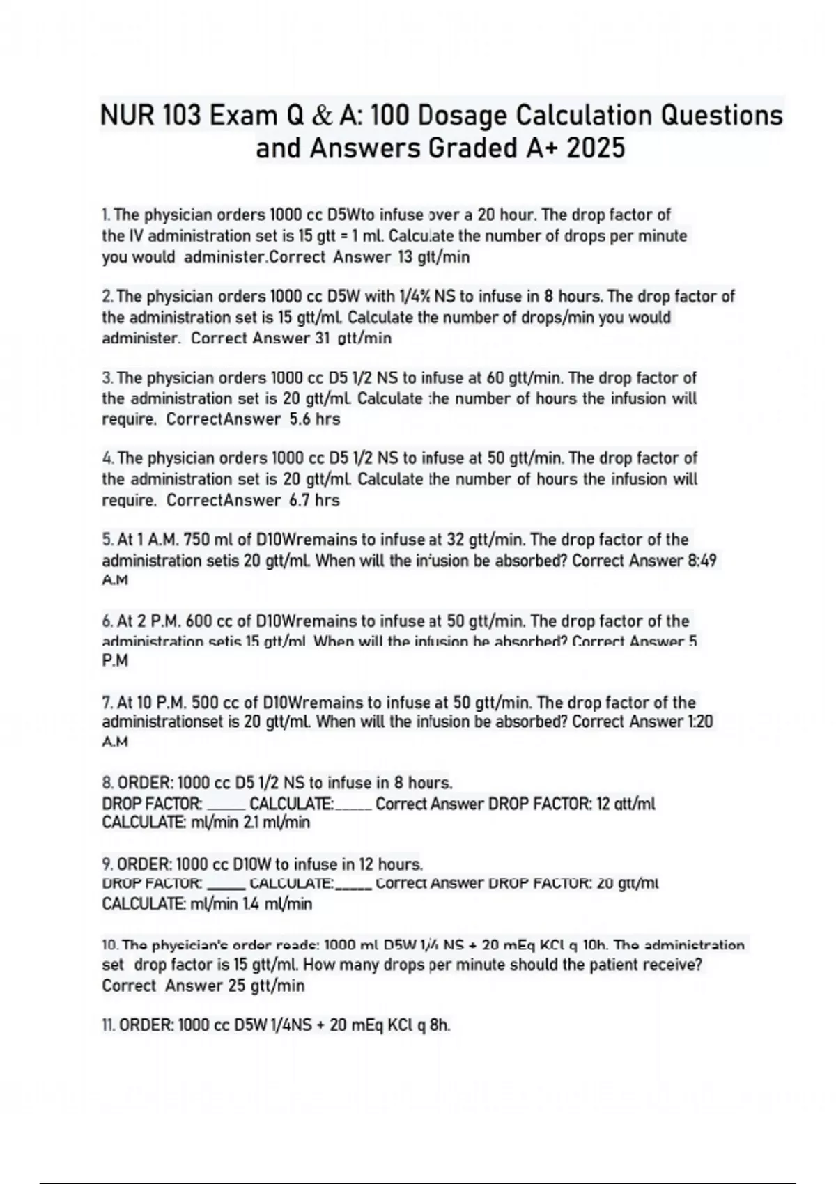 1. The physician orders 1000 cc D5Wto infuse over a 20 hour. The drop factor of the IV administration set is 15 gtt = 1 ml. Calculate the number of drops per minute you would administer.Correct Answer 13 gtt/min 2. The physician orders 1000 cc D5W with 1/4% NS to infuse in 8 hours. The drop factor of the administration set is 15 gtt/ml. Calculate the number of drops/min you would administer. Correct Answer 31 gtt/min 3. The physician orders 1000 cc D5 1/2 NS to infuse at 60 gtt/min. The drop factor of the administration set is 20 gtt/ml. Calculate the number of hours the infusion will require. CorrectAnswer 5.6 hrs 4. The physician orders 1000 cc D5 1/2 NS to infuse at 50 gtt/min. The drop factor of the administration set is 20 gtt/ml. Calculate the number of hours the infusion will require. CorrectAnswer 6.7 hrs 5. At 1 A.M. 750 ml of D10Wremains to infuse at 32 gtt/min. The drop factor of the administration setis 20 gtt/ml. When will the infusion be absorbed? Correct Answer 8:49 A.M 6. At 2 P.M. 600 cc of D10Wremains to infuse at 50 gtt/min. The drop factor of the administration setis 15 gtt/ml. When will the infusion be absorbed? Correct Answer 5 P.M 7. At 10 P.M. 500 cc of D10Wremains to infuse at 50 gtt/min. The drop factor of the administrationset is 20 gtt/ml. When will the infusion be absorbed? Correct Answer 1:20 A.M 8. ORDER: 1000 cc D5 1/2 NS to infuse in 8 hours. DROP FACTOR: ______ CALCULATE: _____ Correct Answer DROP FACTOR: 12 gtt/ml CALCULATE: ml/min 2.1 ml/min 9. ORDER: 1000 cc D10W to infuse in 12 hours. DROP FACTOR: ______ CALCULATE: _____ Correct Answer DROP FACTOR: 20 gtt/ml CALCULATE: ml/min 1.4 ml/min 10. The physician's order reads: 1000 ml D5W 1/4 NS + 20 mEq KCl q 10h. The administration set drop factor is 15 gtt/ml. How many drops per minute should the patient receive? Correct Answer 25 gtt/min 11. ORDER: 1000 cc D5W 1/4NS + 20 mEq KCl q 8h. DROP FACTOR: _________ CALCULATE: ______ Correct Answer DROP FACTOR: 12 gtt/ml CALCULATE:gtt/min 25 gtt/min 12. ORDER: 1000 ml D5 1/2 NS with 20 mEq KCl to infuse in 12 hours.DROP FACTOR: _________ CALCULATE: ______ Correct Answer DROP FACTOR: 15 gtt/ml CALCULATE: gtt/min 21 gtt/min 13. Your patient is to receive 1000 ml D5W 1/2 NS with 30 mEq KCl and 1 duplex package of Beroccaat 70 cc/hr. The administration set drop factor is 15 drops per ml. Calculate the drops of fluid per minute your patient will receive. Correct Answer 18 gtt/min 14. ORDER: Liter Plasmalyte 56 D5Wat 80 cc/hr.DROP FACTOR: _________ CALCULATE: _________Correct Answer DROP FACTOR: 12 gtt/ml CALCULATE: gtt/min 16 gtt/min 15. ORDER: Liter Plasmalyte 56 D5Wat 60 ml/hr.DROP FACTOR: _________ CALCULATE: _________Correct Answer DROP FACTOR: 15 gtt/ml CALCULATE: gtt/min 15 gtt/min 16. ORDER: 500 cc .9% NS with 100 units U100 Regular insulin at 7 units/hrDROP FACTOR: _________ CALCULATE: ______ Correct Answer DROP FACTOR: 60 gtt/ml CALCULATE: gtt/min 35 gtt/min 17. ORDER: 500 cc .9% NS with 100 units U100 Regular Insulin at 10 units/hrDROP FACTOR: ________ CALCULATE: _____ Correct Answer DROP FACTOR: 60 gtt/ml CALCULATE: gtt/min 50 gtt/min 18. ORDER: 500 cc .9% NS with 50 units U100 Regular Insulin at 6 units/hrDROP FACTOR: ________ CALCULATE: _____ Correct Answer DROP FACTOR: 60 gtt/ml CALCULATE: gtt/min 60 gtt/min 19. Your patient is to receive 500 cc D5W.45% NS + one ampule NA HCO3 at 22 gtt/min. The label on the administration set specifies 60 drops per ml. Calculate the number of hours the infusion requires. Correct Answer 22.7 hrs 20. The physician has ordered 1000 cc D5W 0.9% NS every 10 hours. The administration set drop factor is 20 gtt = 1 ml. How many drops per minute should the IV infuse? Correct Answer 33 gtt/min 21. The physician has ordered 1000 cc D5W 0.9% NS every 12 hours. The administration set drop factor is 12 gtt = 1 ml. How many drops per minute should the IV infuse? Correct Answer 17 gtt/min 22. At 11 A.M. 640 ml Plasmalyte 56 is infusing at 20 gtt/min with an administration set of 15 gtt/ml. What time will the infusion be absorbed? Correct Answer 7 P.M 23. At 9 A.M. 560 ml Plasmalyte 56 is infusing at 30 gtt/min with an administration set of 12 gtt/ml. What time will the infusion be absorbed? Correct Answer 12:44 P.M 24. At 3 P.M. 220 ml Plasmalyte 56 is infusing at 24 gtt/min with an administration set of 15 gtt/ml. What time will the infusion be absorbed? Correct Answer 5:18 P.M 25. The physician has ordered a liter of 0.9% NS + 15 mEq KCl at 2 ml/min. The administration setdrop factor is 15 gtt = 1 ml. How many drops per minute should the IV infuse? Correct Answer 30 gtt/min 26. The physician has ordered a liter of 0.9% NS + 15 mEq KCl at 2.5 ml/min. The administration set drop factor is 12 gtt = 1 ml. How many drops per minute should the IV infuse? Correct Answer 30 gtt/min 27. Your patient is to receive 1000 ml D5 NS at 50 cc/hr. The label on the administration set specifies20 drops per 1 ml. Calculate the drops per minute. Correct Answer 17 gtt/min 28. Your patient is to receive 1000 cc D5 NS at 100 cc/hr. The label on the administration setspecifies 15 drops per 1 ml. Calculate the drops per minute. Correct Answer 25 gtt/min 30. ORDER: 1000 ml NS with 20 mEq KCl to infuse in 14 hours. DROP FACTOR: __________ CALCULATE: _________Correct Answer DROP FACTOR: 20 gtt/ml CALCULATE: cc/min 1.2 cc/min 29. Your patient is to receive 1000 ml D5 NS at 125 cc/hr. The label on the administration set specifies 12 drops per 1 ml. Calculate the drops per minute. Correct Answer 25 gtt/min 31. ORDER: 1000 cc NS with 20 mEq KCl to infuse in 7 hours.DROP FACTOR: __________ CALCULATE: _________Correct Answer DROP FACTOR: 15 gtt/ml CALCULATE: ml/min 2.4 ml/min 32. The physician has ordered 1000 ml D5Wto infuse in 6 hours. The administration set drop factor is 15 gtt = 1 ml. How many drops per minute should the IV infuse? Correct Answer 42 gtt/min 33. The physician has ordered 1000 ml D5Wto infuse in 7 hours. The administration set drop factoris 12 gtt 