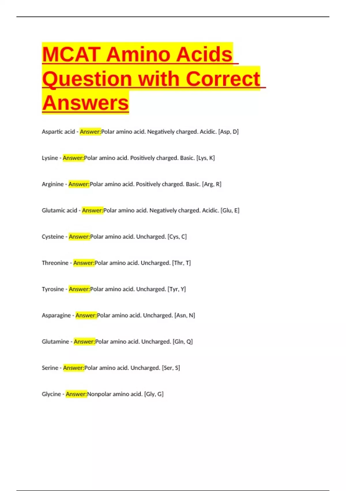MCAT Amino Acids Question with Correct Answers