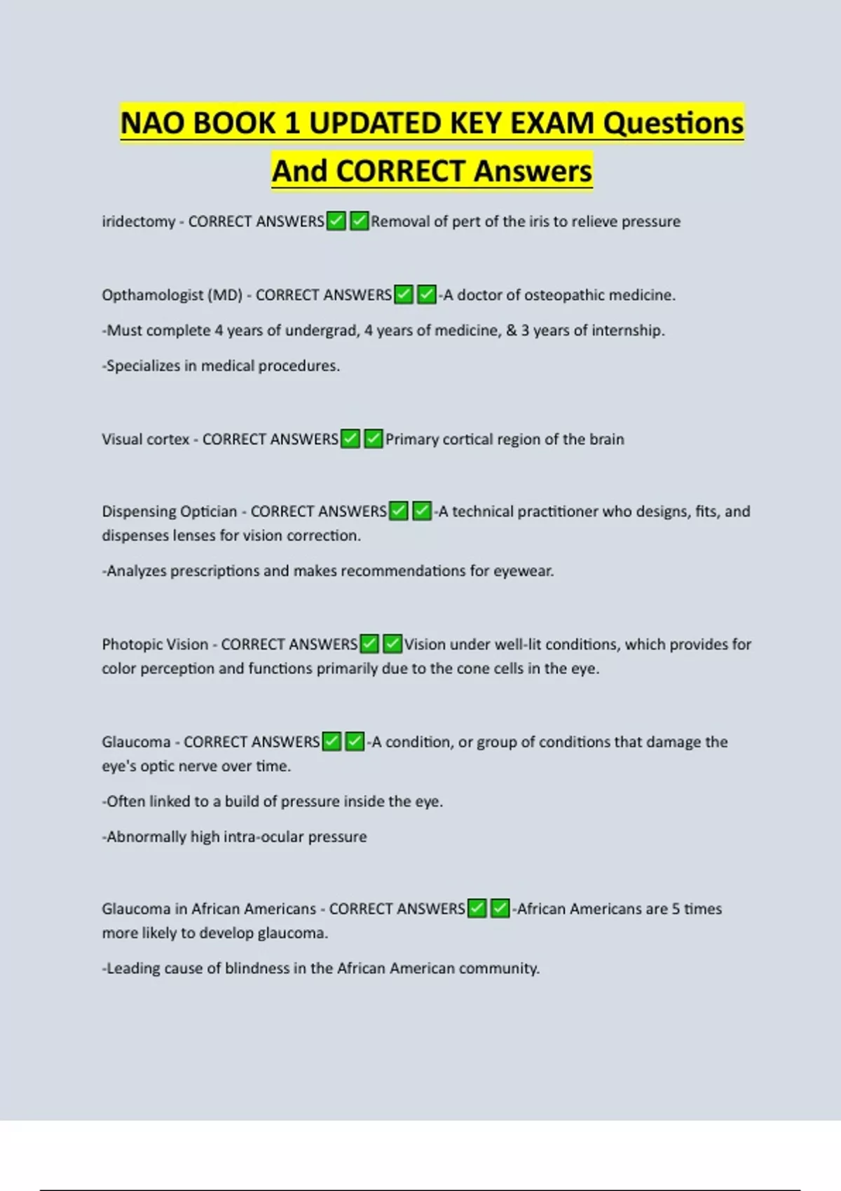 NAO BOOK 1 UPDATED KEY EXAM Questions And CORRECT Answers iridectomy - CORRECT ANSWERS Removal of pert of the iris to relieve pressure Opthamologist (MD) - CORRECT ANSWERS -A doctor of osteopathic medicine. -Must complete 4 years of undergrad, 4 years of medicine, & 3 years of internship. -Specializes in medical procedures. Visual cortex - CORRECT ANSWERS Primary cortical region of the brain Dispensing Optician - CORRECT ANSWERS dispenses lenses for vision correction. -A technical practitioner who designs, fits, and -Analyzes prescriptions and makes recommendations for eyewear. Photopic Vision - CORRECT ANSWERS Vision under well-lit conditions, which provides for color perception and functions primarily due to the cone cells in the eye. Glaucoma - CORRECT ANSWERS eye's optic nerve over time. -A condition, or group of conditions that damage the -Often linked to a build of pressure inside the eye. -Abnormally high intra-ocular pressure Glaucoma in African Americans - CORRECT ANSWERS more likely to develop glaucoma. -African Americans are 5 times -Leading cause of blindness in the African American community.