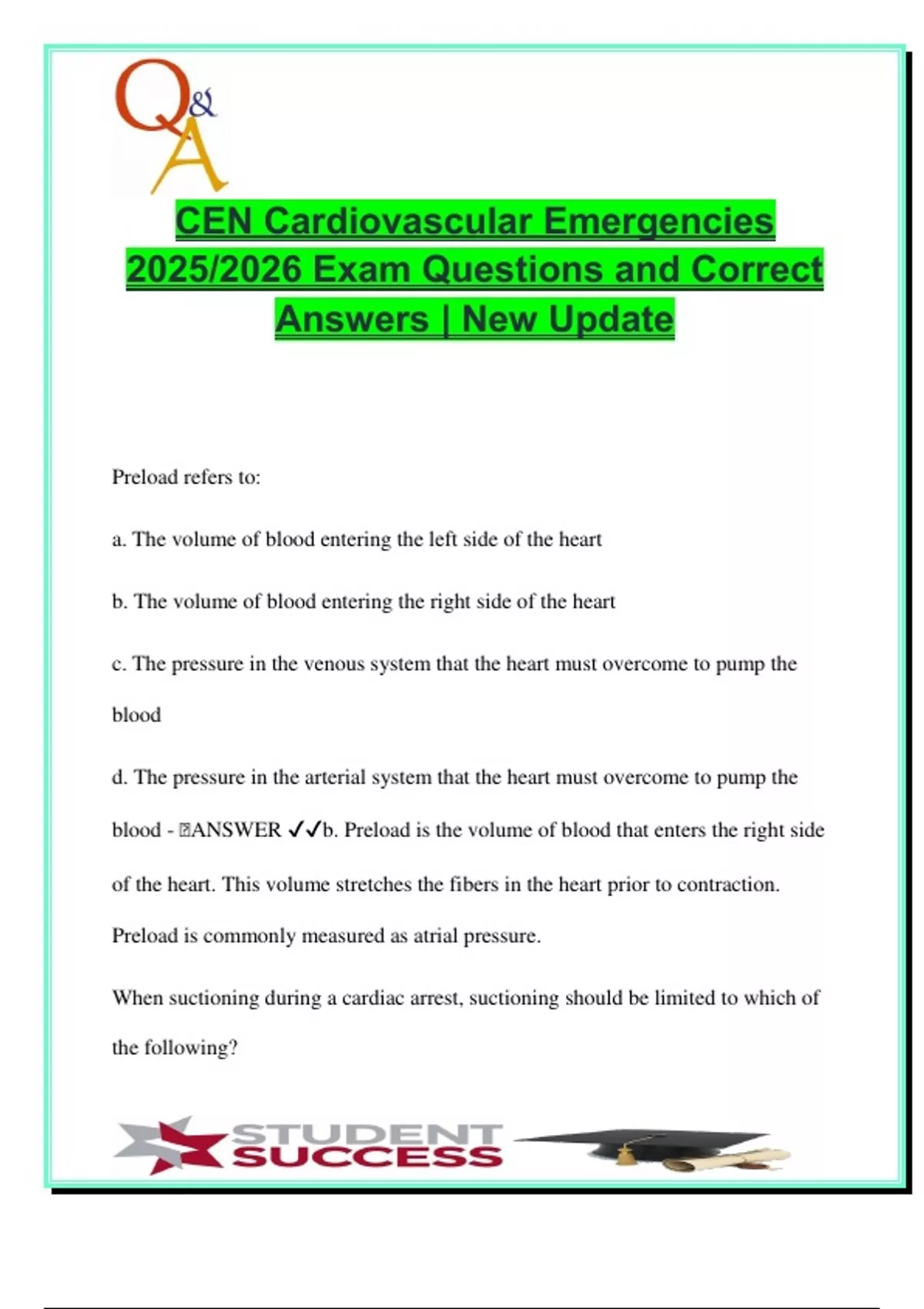 This focused CEN review guide features over 100 advanced cardiovascular emergency questions and answers designed to reflect the format, clinical rigor, and content areas of the Certified Emergency Nurse (CEN) exam for the 2025/2026 testing year. Each question includes a detailed rationale, aligning with the latest AHA guidelines, ACLS protocols, and emergency nursing best practices. The document thoroughly covers the following high-yield cardiovascular topics: Cardiac Arrest & Resuscitation: ACLS post-defibrillation protocols, PETCO₂ interpretation, high-quality CPR indicators, intraosseous drug administration Acute Coronary Syndrome (ACS): Oxygen-Aspirin-Nitroglycerin-Morphine (OANM) sequence, cardiac biomarkers (Troponin vs. CK-MB), contraindications to fibrinolytics Cardiac Dysrhythmias & Treatment: Tachycardia with hypotension, cardioversion vs. medication, use of amiodarone, adenosine, and synchronized shock Cardiac Trauma & Aneurysms: Blunt cardiac injury, dissecting aortic aneurysm management, pericarditis vs. MI, tamponade (Beck’s Triad), thoracotomy Heart Failure & Fluid Overload: Key findings (S3 sounds, JVD, rales), treatment priorities (airway first), medication sequencing Pediatric Cardiac Arrest: Arrest progression (respiratory → shock → cardiac), non-SIDS etiologies, magnesium for torsades de pointes Emergency Diagnostics: Interpretation of EKG, blood pressure management, endotracheal medication dosing, IO vs IV access This guide is indispensable for candidates preparing for the BCEN’s CEN certification, new ER nurses seeking core competency, or advanced students in trauma and cardiovascular emergency care. Recommended for: Courses: CEN Exam Prep, Emergency Cardiovascular Nursing, ACLS Certification Training Programs: BCEN Certification Programs, Emergency Department Clinical Residency, Advanced Nursing Pathophysiology Users: Emergency RNs, trauma nurses, ER nurse interns, critical care nurses, and EMS professionals transitioning to hospital roles Keywords: CEN 2025, cardiovascular emergencies, cardiac arrest, ACS treatment, Troponin I, PETCO2, synchronized cardioversion, IO access, CPR guidelines, aortic dissection, cardiac tamponade, pericarditis, endocarditis, blunt chest trauma, pediatric CPR, S3 heart sound, fibrinolytics contraindications, high-quality CPR, dissecting aneurysm, ACLS drug doses