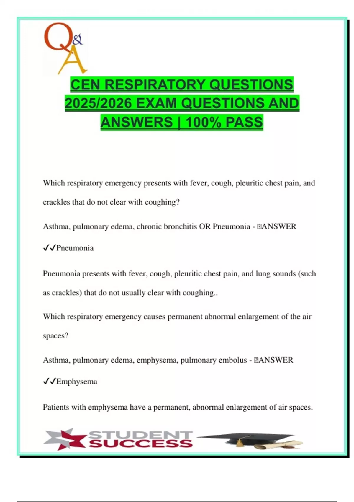This advanced emergency nursing resource delivers over 100 respiratory-focused CEN questions and correct answers, tailored for the Certified Emergency Nurse (CEN) exam 2025/2026. Each question comes with a clear, clinical rationale grounded in pathophysiology, evidence-based practice, and emergency protocols, ensuring comprehensive mastery of respiratory care concepts. Topics include: Acute & Chronic Pulmonary Conditions: Pneumonia, emphysema, pulmonary embolism, asthma exacerbations, bronchitis, and pulmonary edema Emergency Assessment & Intervention: Tripod positioning, barrel chest, peak expiratory flow rate, auscultation findings (crackles, vesicular sounds, wheezes) Oxygenation & Ventilation Physiology: Negative pressure mechanics, diffusion vs. perfusion, surfactant function, CO₂ shifts on the oxygen dissociation curve Respiratory Medications: Albuterol, prednisone, magnesium sulfate, theophylline, racemic epinephrine, ipratropium, heliox, morphine sulfate, low-molecular-weight heparin Respiratory Diagnostics & Prioritization: ABGs, capnography (ETCO₂), peak flow, auscultation placement, pneumonia core measures, pneumothorax signs Special Cases: Pediatric airway emergencies, carbon monoxide poisoning, aspiration, chronic bronchitis complications, asthma triggers This document is designed for advanced practice, exam preparation, and clinical reinforcement. It’s ideal for reviewing the full scope of respiratory emergencies that appear on the CEN exam and aligns closely with BCEN guidelines. Recommended for: Courses: Emergency Nursing, Respiratory Pathophysiology, Pulmonary Emergencies, Advanced Medical-Surgical Nursing Programs: BCEN CEN Certification Prep, Emergency Department Orientation, Critical Care Residency Users: CEN exam candidates, emergency nurses, nurse educators, advanced nursing students, EMS professionals entering hospital care Keywords: CEN 2025, respiratory emergencies, pulmonary embolism, pneumonia symptoms, ABG interpretation, peak flow rate, emphysema, asthma attack treatment, bronchial sounds, vesicular breath sounds, oxygen dissociation curve, CO2 tension, pulmonary edema, CPAP, diuretics, ETCO2, capnography, magnesium sulfate, racemic epinephrine, bronchodilator medications