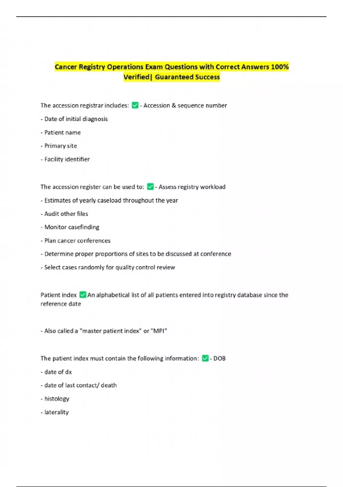 Cancer Registry Operations Exam Questions with Correct Answers 100% Verified| Guaranteed Success