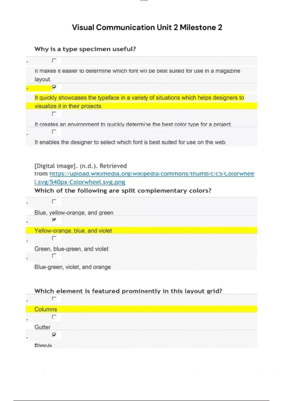 Visual Communication Unit 2 Milestone 2 Why is a type specimen useful? • It makes it easier to determine which font will be best suited for use in a magazine layout. • It quickly showcases the typeface in a variety of situations which helps designers to visualize it in their projects. • It creates an environment to quickly determine the best color type for a project. • It enables the designer to select which font is best suited for use on the web. [Digital image]. (n.d.). Retrieved from Which of the following are split complementary colors? Which element is featured prominently in this layout grid? • Columns • Gutter • Bleeds lOMoARcPSD| A member of a complete set of letters, numbers and punctuation symbols • A capital letter form using different weights and widths • Contains the name of the publisher, family, weight, posture and width • Contains all capital letterforms, of consistent posture and width • Rebus • Big type • Frame • Picture window • How tall is a word that is set in 72-point type? • One-half inch • One pica • One inch Which of the following defines a typeface? (n.d.). Retrieved from t,_ Which of the layout styles below is used in this image? Caption • lOMoARcPSD| This style is characterized by slab serifs and the use of even-weight strokes. • This style is characterized by low contrast between thick and thin strokes, and distinctive numerals. • This style is characterized by elaborate, straight, angular strokes. • This style is characterized by a geometric quality, with hairline thin serifs and extreme contrast between thick and thin strokes.