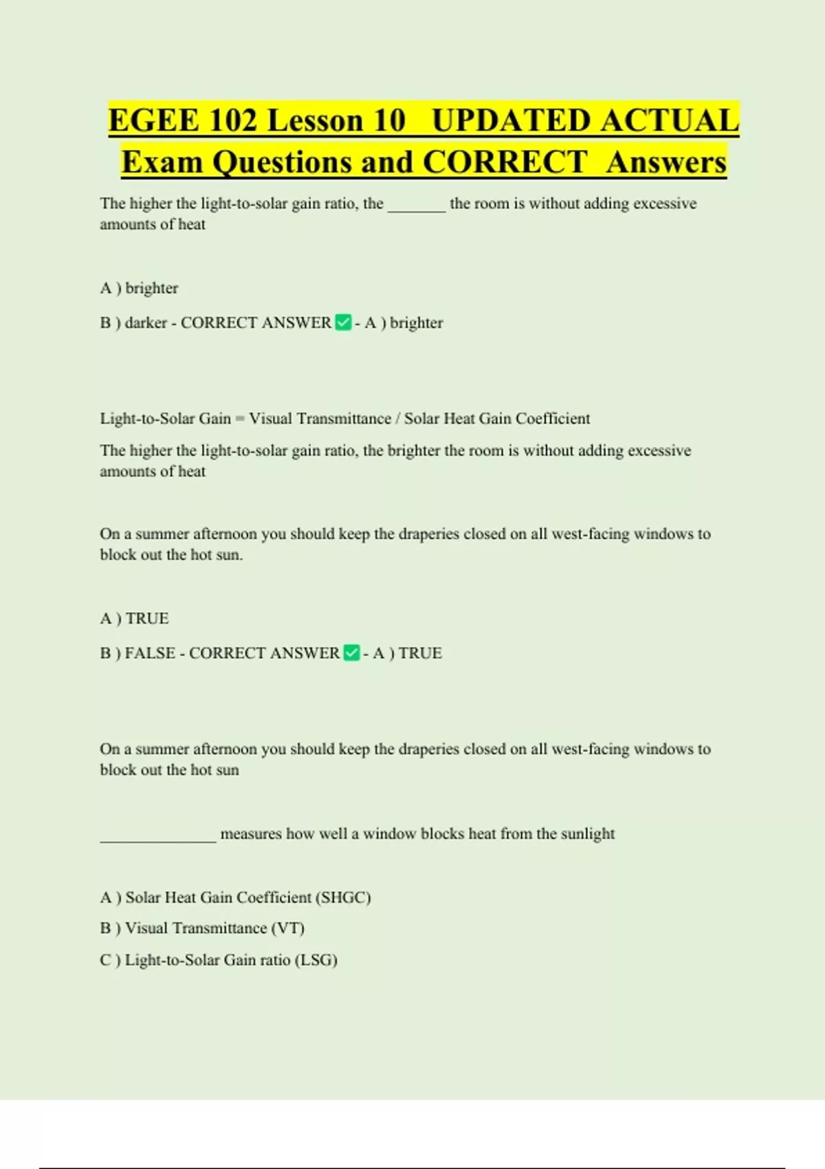 ,D ) Air Leakage (AL) - CORRECT ANSWER - A ) Solar Heat Gain Coefficient (SHGC)