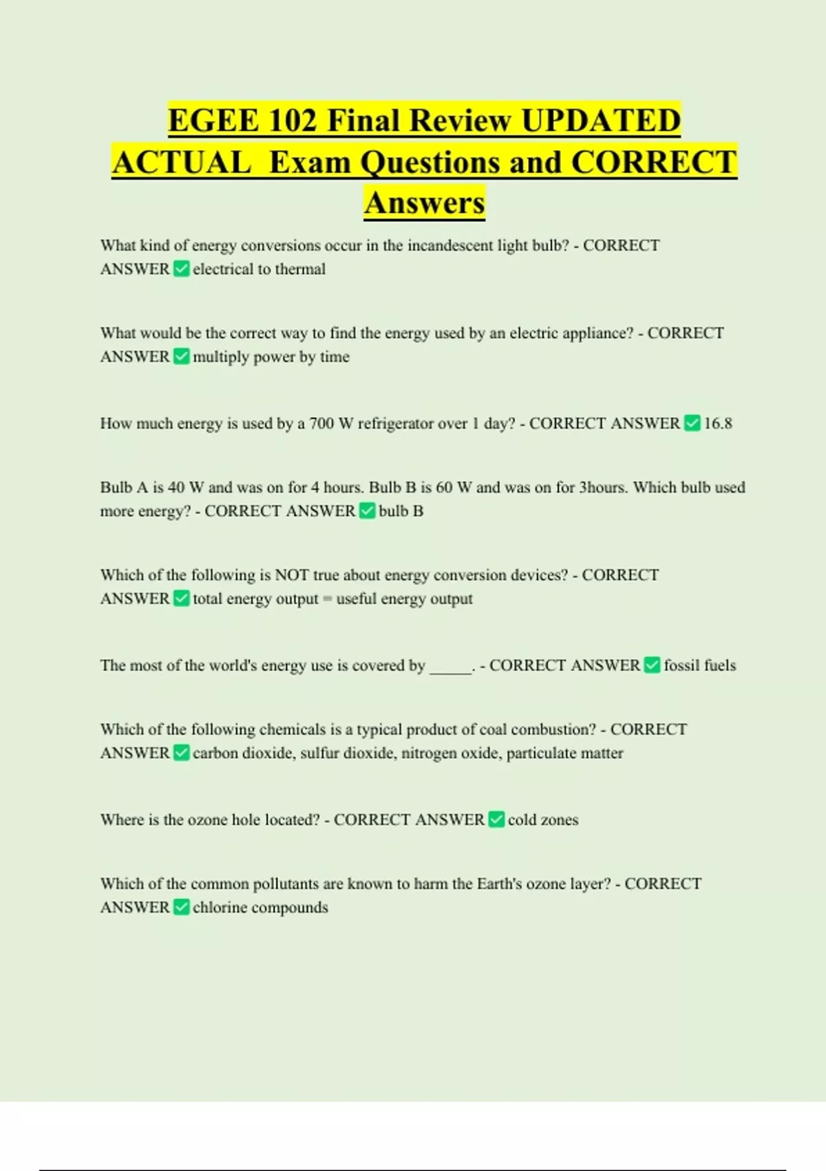 EGEE 102 Final Review UPDATED ACTUAL Exam Questions and CORRECT Answers What kind of energy conversions occur in the incandescent light bulb? - CORRECT ANSWER electrical to thermal What would be the correct way to find the energy used by an electric appliance? - CORRECT ANSWER multiply power by time How much energy is used by a 700 W refrigerator over 1 day? - CORRECT ANSWER 16.8 Bulb A is 40 W and was on for 4 hours. Bulb B is 60 W and was on for 3hours. Which bulb used more energy? - CORRECT ANSWER bulb B