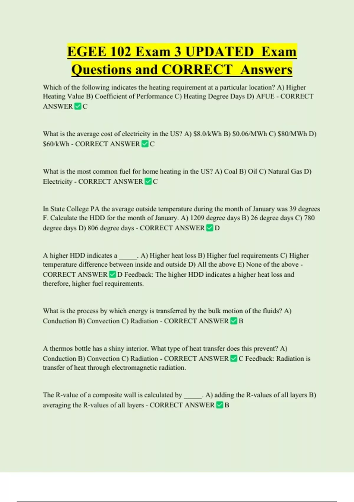 EGEE 102 Exam 3 UPDATED Exam Questions and CORRECT Answers Which of the following indicates the heating requirement at a particular location? A) Higher Heating Value B) Coefficient of Performance C) Heating Degree Days D) AFUE - CORRECT ANSWER C What is the average cost of electricity in the US? A) $8.0/kWh B) $0.06/MWh C) $80/MWh D) $60/kWh - CORRECT ANSWER C What is the most common fuel for home heating in the US? A) Coal B) Oil C) Natural Gas D) Electricity - CORRECT ANSWER C