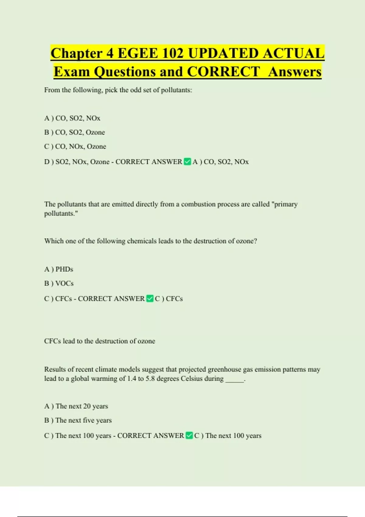 Chapter 4 EGEE 102 UPDATED ACTUAL Exam Questions and CORRECT Answers From the following, pick the odd set of pollutants: A ) CO, SO2, NOx B ) CO, SO2, Ozone C ) CO, NOx, Ozone D ) SO2, NOx, Ozone - CORRECT ANSWER A ) CO, SO2, NOx The pollutants that are emitted directly from a combustion process are called "primary pollutants." Which one of the following chemicals leads to the destruction of ozone
