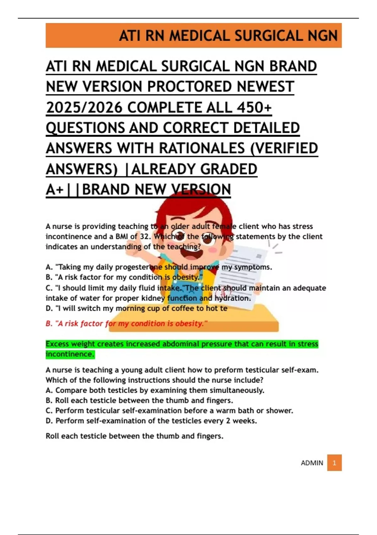 ATI RN MEDICAL SURGICAL NGN BRAND NEW VERSION PROCTORED NEWEST 2025/2026 COMPLETE ALL 450+ QUESTIONS AND CORRECT DETAILED ANSWERS WITH RATIONALES (VERIFIED ANSWERS) |ALREADY GRADED A+||BRAND NEW VERSION A nurse is providing teaching to an older adult female client who has stress incontinence and a BMI of 32. Which of the following statements by the client indicates an understanding of the teaching? A. "Taking my daily progesterone should improve my symptoms. B. "A risk factor for my condition is obesity." C. "I should limit my daily fluid intake."The client should maintain an adequate intake of water for proper kidney function and hydration. D. "I will switch my morning cup of coffee to hot te B. "A risk factor for my condition is obesity." Excess weight creates increased abdominal pressure that can result in stress incontinence. A nurse is teaching a young adult client how to preform testicular self-exam. Which of the following instructions should the nurse include? A. Compare both testicles by examining them simultaneously. B. Roll each testicle between the thumb and fingers. C. Perform testicular self-examination before a warm bath or shower. D. Perform self-examination of the testicles every 2 weeks. Roll each testicle between the thumb and fingers. ATI RN MEDICAL SURGICAL NGN ADMIN 2 The nurse should instruct the client to roll each testicle horizontally between the thumbs and fingers to feel for any lumps deep in the center of the testicle. A nurse is caring for a client who has a dx of hyperthyroidism. Which of the following is the priority assessment finding that the nurse should report to the provider? A. Restlessness B. T3 level 215 ng/dL C. Blood pressure 170/80 mm Hg D. Decreased weight C. Blood pressure 170/80 mm Hg Using the urgent vs. nonurgent approach to client care, the nurse should determine that the priority finding is a systolic blood pressure of 170 mm Hg, which indicates that the client is at risk for thyroid storm. .! A nurse is providing discharge instructions to a client who has a partial thickness burn of the hand. Which of the following instructions should the nurse include? A. Change the dressing every 72 hr. B. Immobilize the hand with a pressure dressing. C. Take pain medication 30 min after changing the dressing. D. Wrap fingers with individual dressings. D. Wrap fingers with individual dressings. The nurse should instruct the client to wrap the fingers individually to allow for functional use of the hand while healing occurs. The nurse should also instruct the client to perform range-of-motion exercises to each finger every hour while awake to promote function of the injured hand. A nurse is caring for a client who has a closed head injury and has an intraventricular catheter placed. Which of the following findings indicates that the client is experiencing ICP? (select all that apply) Flat jugular veins A Glasgow Coma Scale score of 15 ATI RN MEDICAL SURGICAL NGN ADMIN 3 Sleepiness exhibited by the client Widening pulse pressure Decerebrate posturing Sleepiness exhibited by the client is correct. Sleepiness or difficulty arousing the client from sleep is an indication of increased ICP. Widening pulse pressure is correct. A widening pulse pressure (increase in systolic with concurrent decrease in diastolic blood pressure) is an indication of increased ICP. Decerebrate posturing is correct. Both decerebrate and decorticate posturing indicate increased ICP. A nurse in an ICU is assessing a client who has a traumatic brain injury. Which of the following findings should the nurse identify as a component of Cushing's triad? Hypotension Tachypnea Nuchal rigidity Bradycardia Bradycardia A client who has increased intracranial pressure from a traumatic brain injury can develop bradycardia, which is one component of Cushing's triad. The other components of Cushing's triad are severe hypertension and a widened pulse pressure. A nurse is providing teaching to a client who has chronic kidney disease and a new prescription for erythropoietin. Which of the following statements by the client indicates an understanding of the teaching? "I should take calcium supplements so the medication will work better in my system." "I am taking this medication to increase my energy level."' "This medication can cause my blood pressure to drop." "I will not need to restrict protein in my diet while taking this medication." "I am taking this medication to increase my energy level."