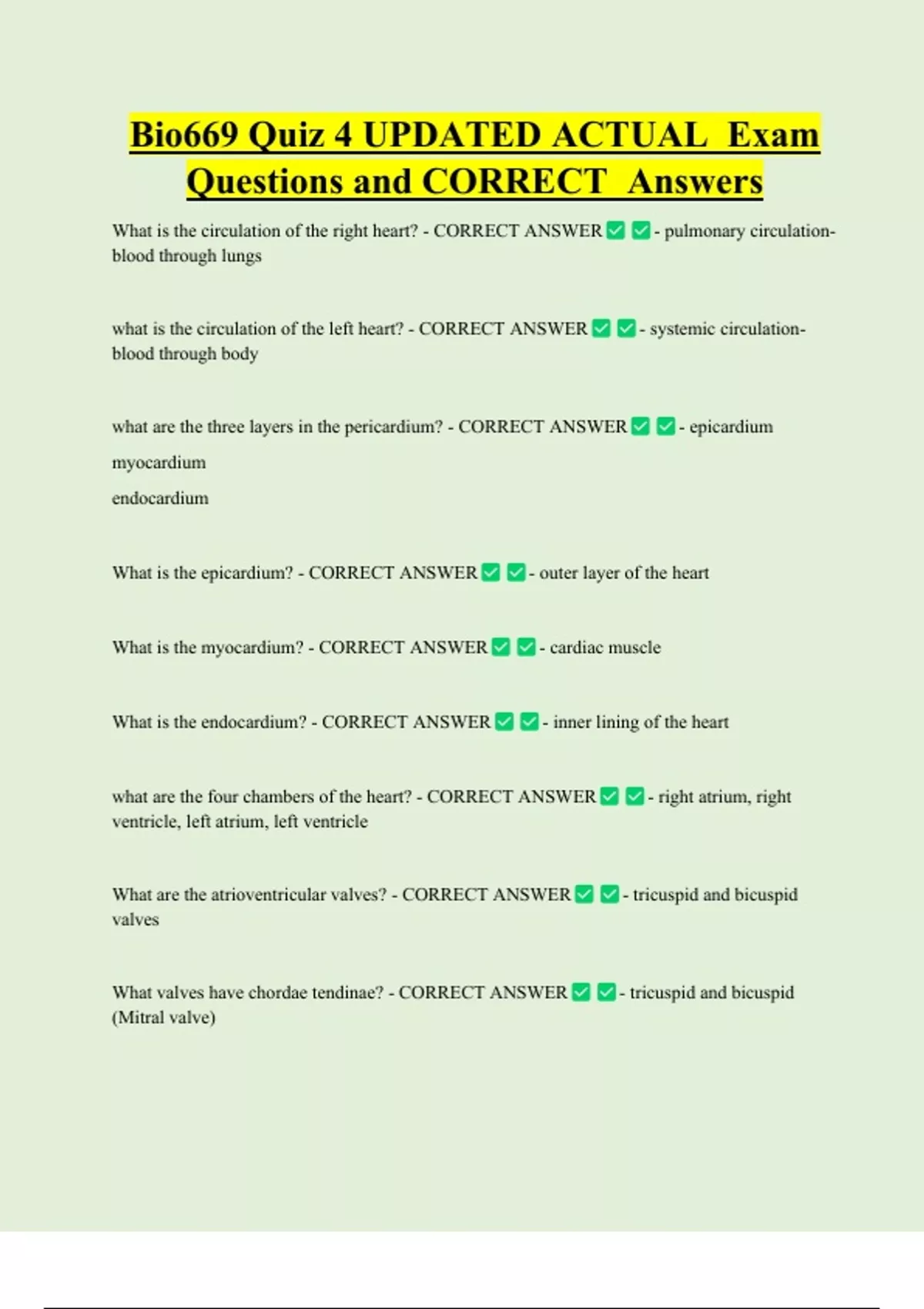 Bio669 Quiz 4 UPDATED ACTUAL Exam Questions and CORRECT Answers What is the circulation of the right heart? - CORRECT ANSWER blood through lungs what is the circulation of the left heart? - CORRECT ANSWER blood through body what are the three layers in the pericardium? - CORRECT ANSWER myocardium endocardium What is the epicardium? - CORRECT ANSWER - pulmonary circulation-- systemic circulation- - epicardium - outer layer of the heart