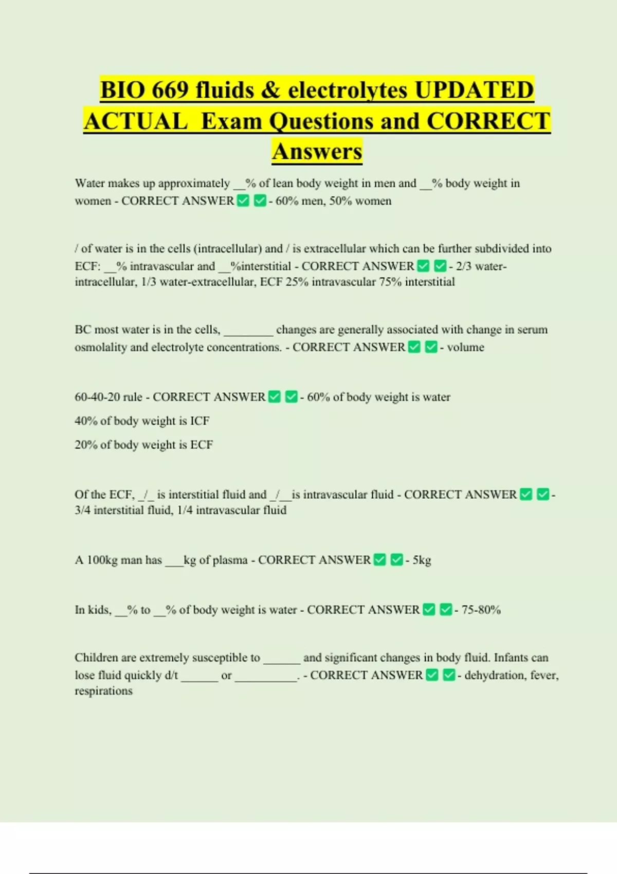 BIO 669 fluids & electrolytes UPDATED ACTUAL Exam Questions and CORRECT Answers Water makes up approximately __% of lean body weight in men and __% body weight in women - CORRECT ANSWER - 60% men, 50% women / of water is in the cells (intracellular) and / is extracellular which can be further subdivided into ECF: __% intravascular and __%interstitial - CORRECT ANSWER - 2/3 water intracellular, 1/3 water-extracellular, ECF 25% intravascular 75% interstitial