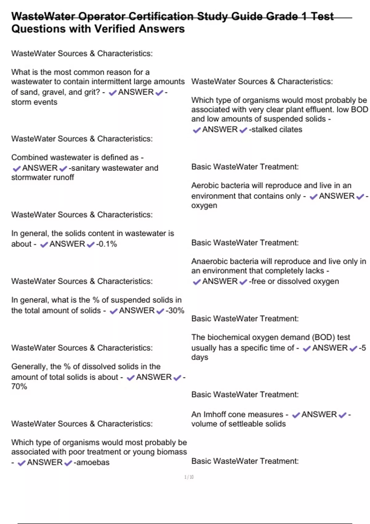 , WasteWater Operator Certification Study Guide Grade 1 Test
