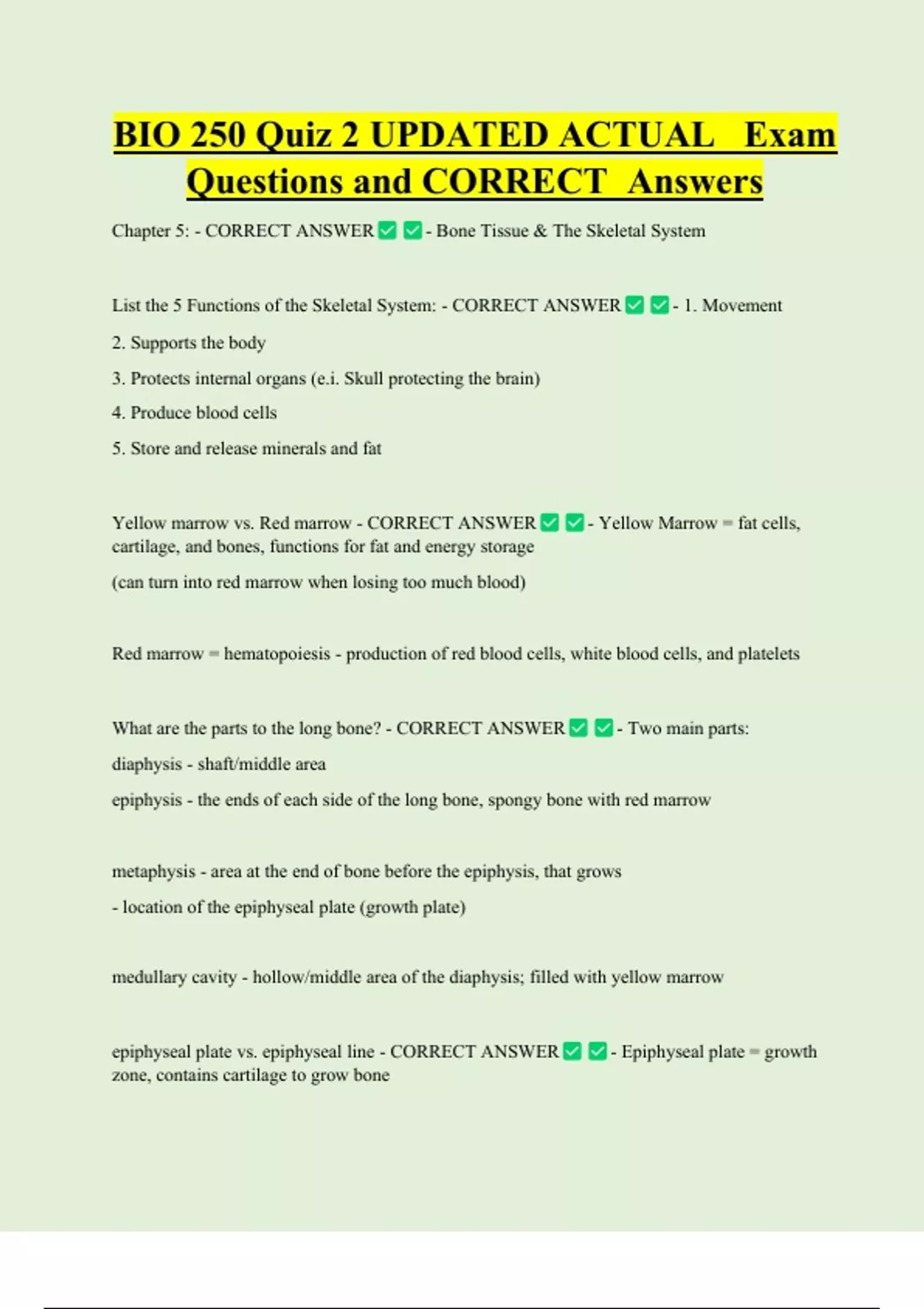 BIO 250 Quiz 2 UPDATED ACTUAL Exam Questions and CORRECT Answers Chapter 5: - CORRECT ANSWER - Bone Tissue & The Skeletal System List the 5 Functions of the Skeletal System: - CORRECT ANSWER 2. Supports the body 3. Protects internal organs (e.i. Skull protecting the brain) 4. Produce blood cells 5. Store and release minerals and fat Yellow marrow vs. Red marrow - CORRECT ANSWER - 1. Movement - Yellow Marrow = fat cells, cartilage, and bones, functions for fat and energy storage (can turn into red marrow when losing too much blood