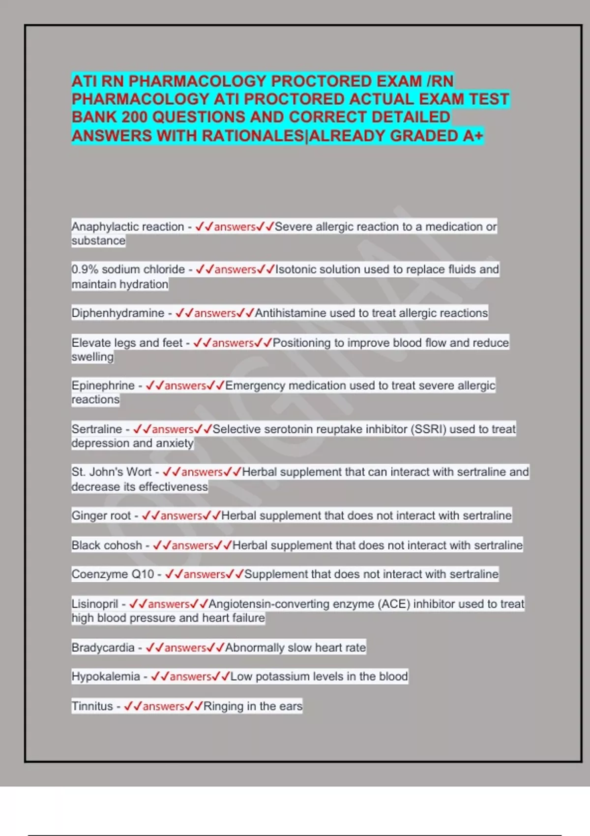 ATI RN PHARMACOLOGY PROCTORED EXAM /RN PHARMACOLOGY ATI PROCTORED ACTUAL EXAM TEST BANK 200 QUESTIONS AND CORRECT DETAILED ANSWERS WITH RATIONALES|ALREADY GRADED A+ Anaphylactic