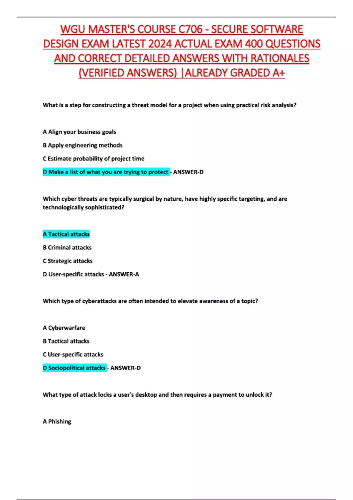 WGU MASTER-S COURSE C706 - SECURE SOFTWARE DESIGN EXAM LATEST 2024 ACTUAL EXAM 400 QUESTIONS AND DETAILED ANSWERS