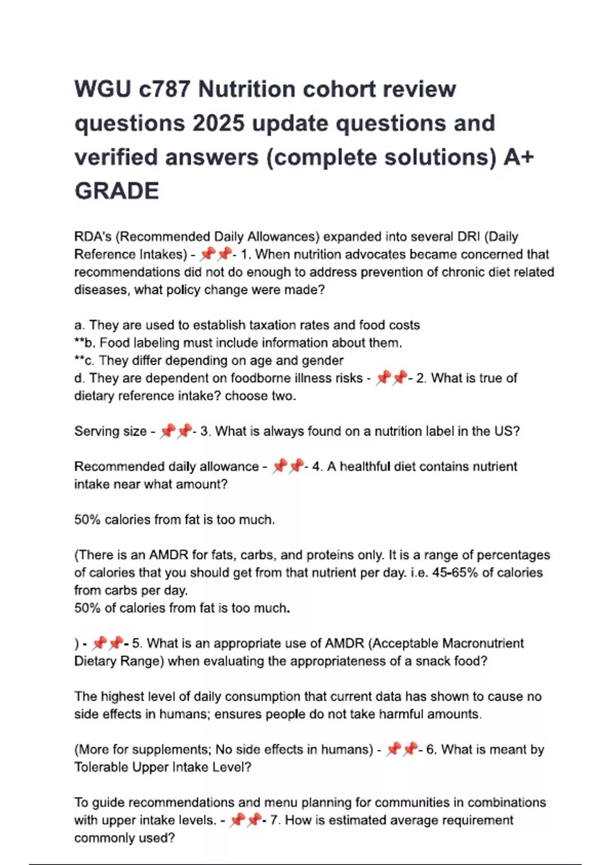 WGU c787 Nutrition cohort review questions 2025 update questions and verified answers
