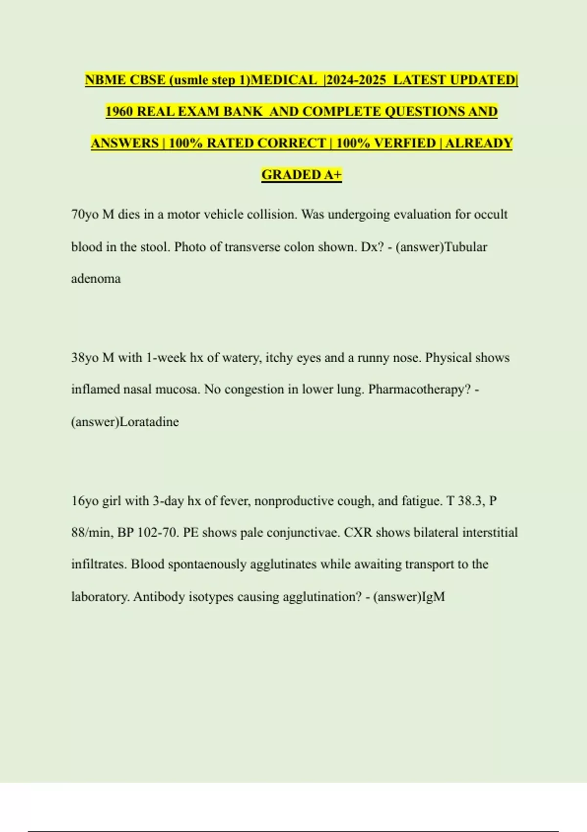 NBME CBSE (usmle step 1)MEDICAL | LATEST UPDATED| 1960 REAL EXAM BANK AND COMPLETE QUESTIONS AND ANSWERS | 100% RATED CORRECT | 100% VERFIED | ALREADY GRADED A+