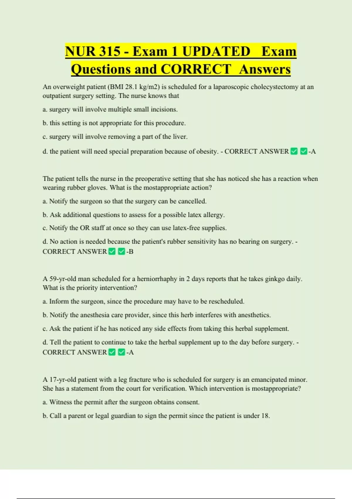 NUR 315 - Exam 1 UPDATED Exam Questions and CORRECT Answers An overweight patient (BMI 28.1 kg/m2) is scheduled for a laparoscopic cholecystectomy at an outpatient surgery setting. The nurse knows that a. surgery will involve multiple small incisions. b. this setting is not appropriate for this procedure. c. surgery will involve removing a part of the liver. d. the patient will need special preparation because of obesity. - CORRECT ANSWER -A The patient tells the nurse in the preoperative setting that she has noticed she has a reaction when wearing rubber gloves. What is the mostappropriate action? a. Notify the surgeon so that the surgery can be cancelled. b. Ask additional questions to assess for a possible latex allerg