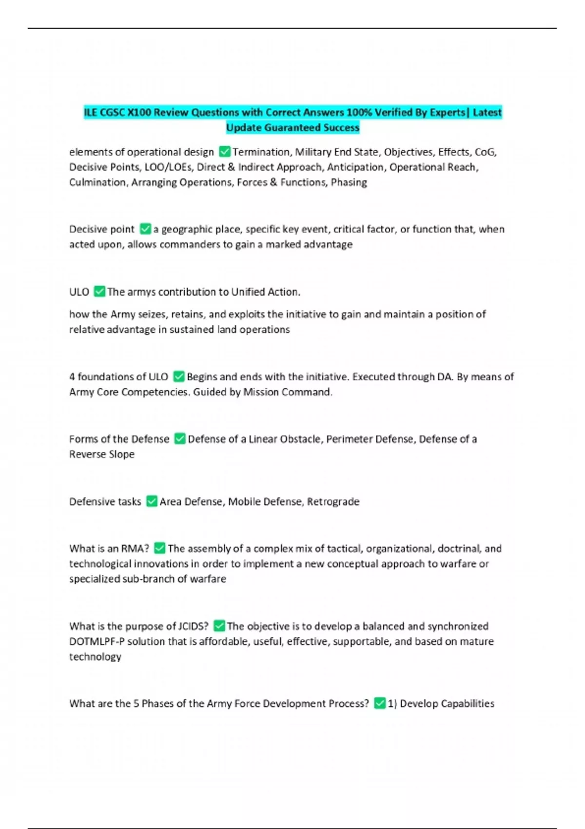 ILE CGSC X100 Review Questions with Correct Answers 100% Verified By Experts| Latest Update Guaranteed Success