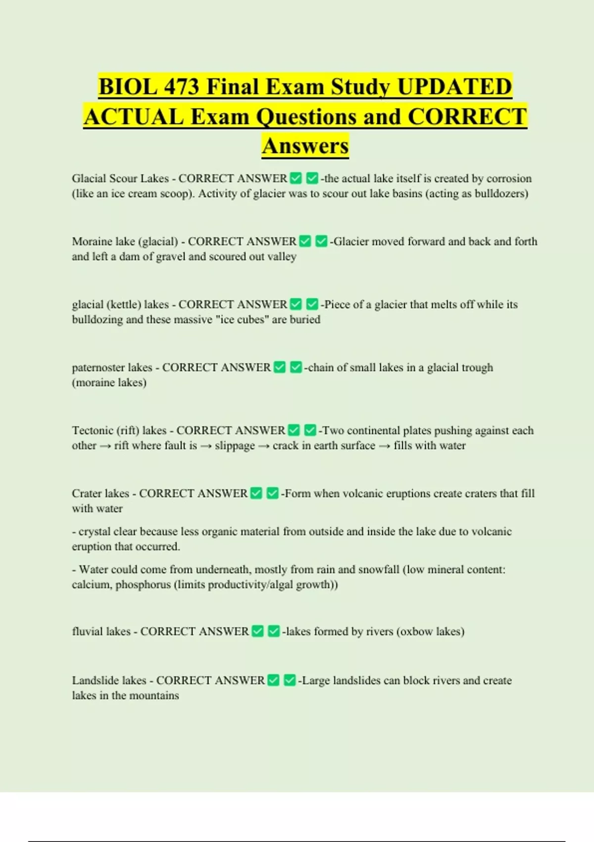 BIOL 473 Final Exam Study UPDATED ACTUAL Exam Questions and CORRECT Answers Glacial Scour Lakes - CORRECT ANSWER -the actual lake itself is created by corrosion (like an ice cream scoop). Activity of glacier was to scour out lake basins (acting as bulldozers) Moraine lake (glacial) - CORRECT ANSWER and left a dam of gravel and scoured out valley glacial (kettle) lakes - CORRECT ANSWER -Glacier moved forward and back and forth -Piece of a glacier that melts off while its bulldozing and these massive "ice cubes" are buried