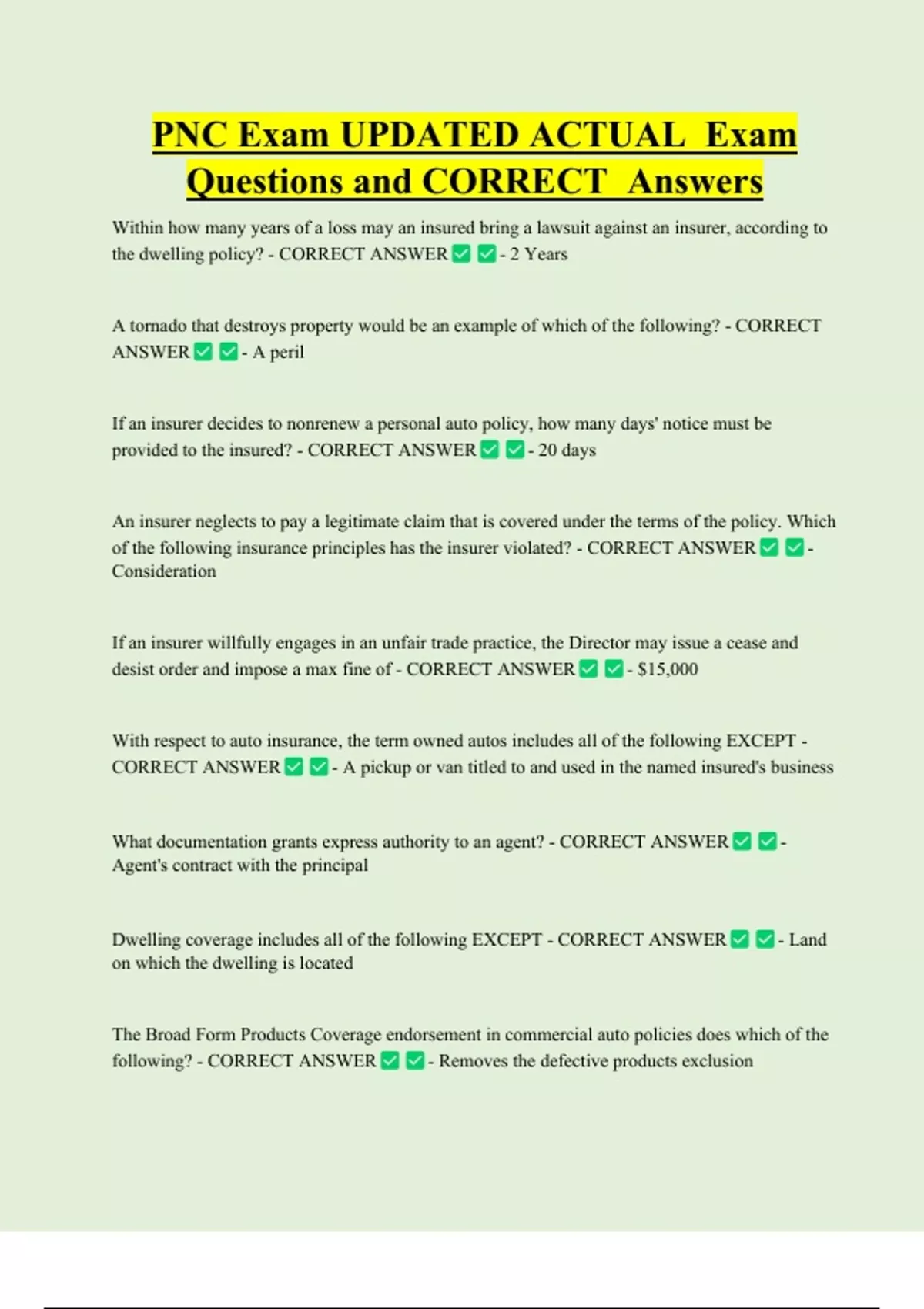PNC Exam UPDATED ACTUAL Exam Questions and CORRECT Answers Within how many years of a loss may an insured bring a lawsuit against an insurer, according to the dwelling policy? - CORRECT ANSWER - 2 Years A tornado that destroys property would be an example of which of the following? - CORRECT ANSWER - A peril If an insurer decides to nonrenew a personal auto policy, how many days' notice must be provided to the insured? - CORRECT ANSWER - 20 days