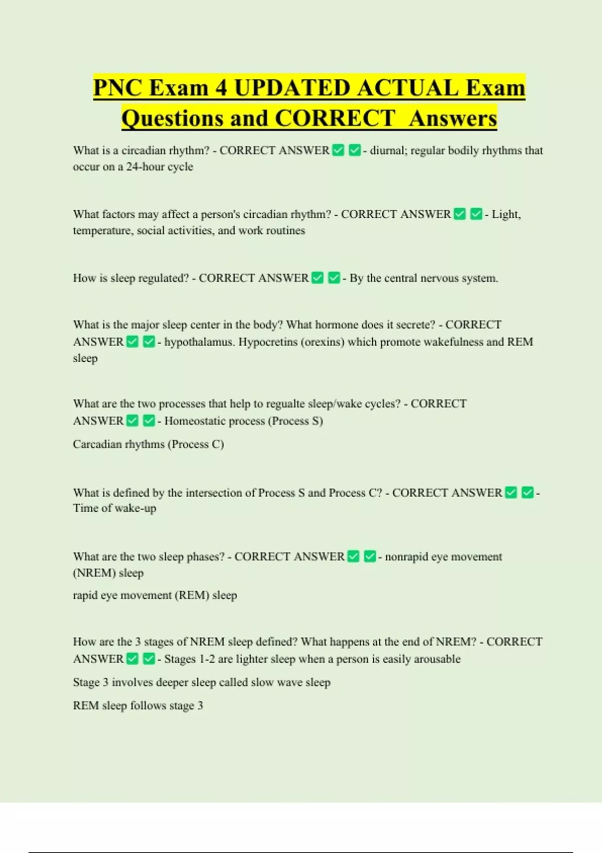 PNC Exam 4 UPDATED ACTUAL Exam Questions and CORRECT Answers What is a circadian rhythm? - CORRECT ANSWER occur on a 24-hour cycle - diurnal; regular bodily rhythms that What factors may affect a person's circadian rhythm? - CORRECT ANSWER temperature, social activities, and work routines How is sleep regulated? - CORRECT ANSWER - Light, - By the central nervous system. What is the major sleep center in the body? What hormone does it secrete? - CORRECT ANSWER - hypothalamus. Hypocretins (orexins) which promote wakefulness and REM sle