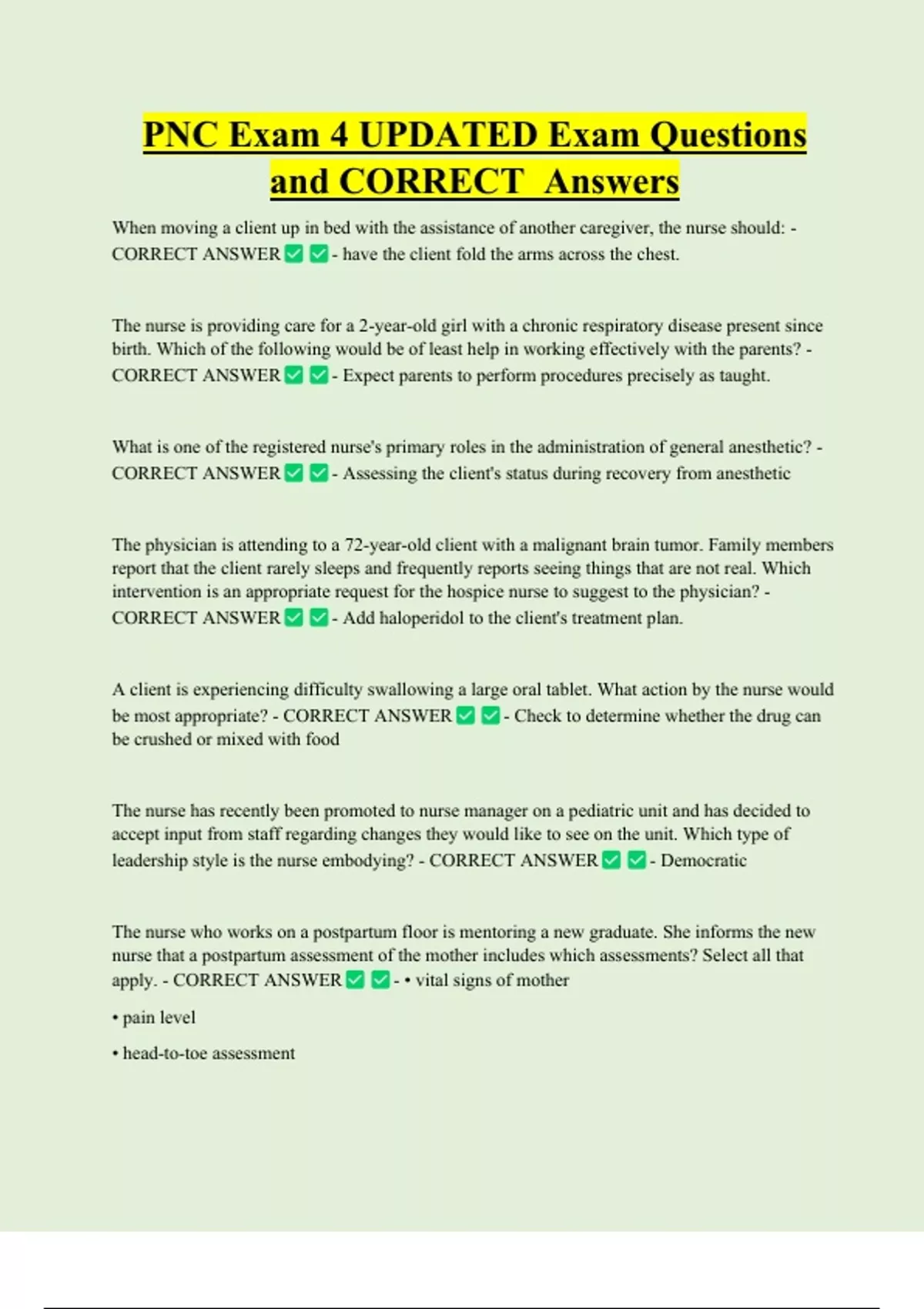 PNC Exam 4 UPDATED Exam Questions and CORRECT Answers When moving a client up in bed with the assistance of another caregiver, the nurse should: - CORRECT ANSWER - have the client fold the arms across the chest. The nurse is providing care for a 2-year-old girl with a chronic respiratory disease present since birth. Which of the following would be of least help in working effectively with the parents? - CORRECT ANSWER - Expect parents to perform procedures precisely as taught. What is one of the registered nurse's primary roles in the administration of general anesthetic? - CORRECT ANSWER - Assessing the client's status during recovery from anesthetic