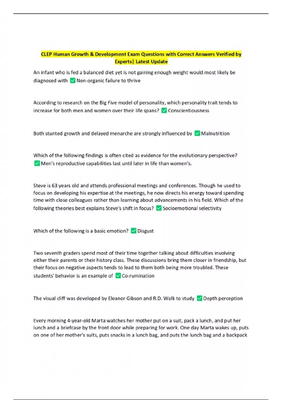 CLEP Human Growth & Development Exam Questions with Correct Answers Verified by Experts| Latest Update
