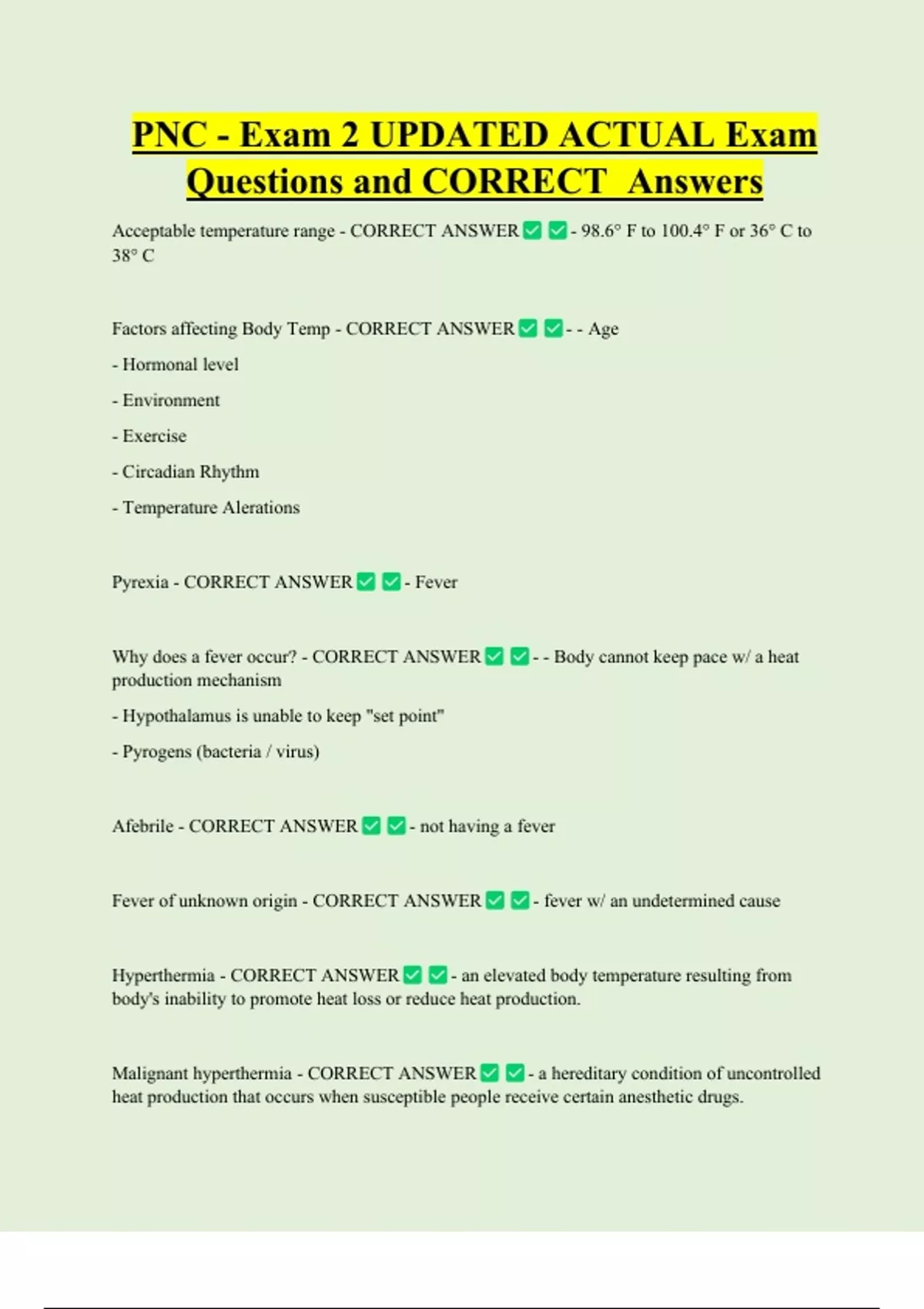 PNC - Exam 2 UPDATED ACTUAL Exam Questions and CORRECT Answers Acceptable temperature range - CORRECT ANSWER 38° C Factors affecting Body Temp - CORRECT ANSWER - Hormonal level - Environment - Exercise - Circadian Rhythm - Temperature Alerations Pyrexia - CORRECT ANSWER - Fever Why does a fever occur? - CORRECT ANSWER production mechanism - Hypothalamus is unable to keep "set point" - Pyrogens (bacteria / virus) Afebrile - CORRECT ANSWER - not having a fever Fever of unknown origin - CORRECT ANSWER Hyperthermia - CORRECT ANSWER - 98.6° F to 100.4° F or 36° C to - - Age