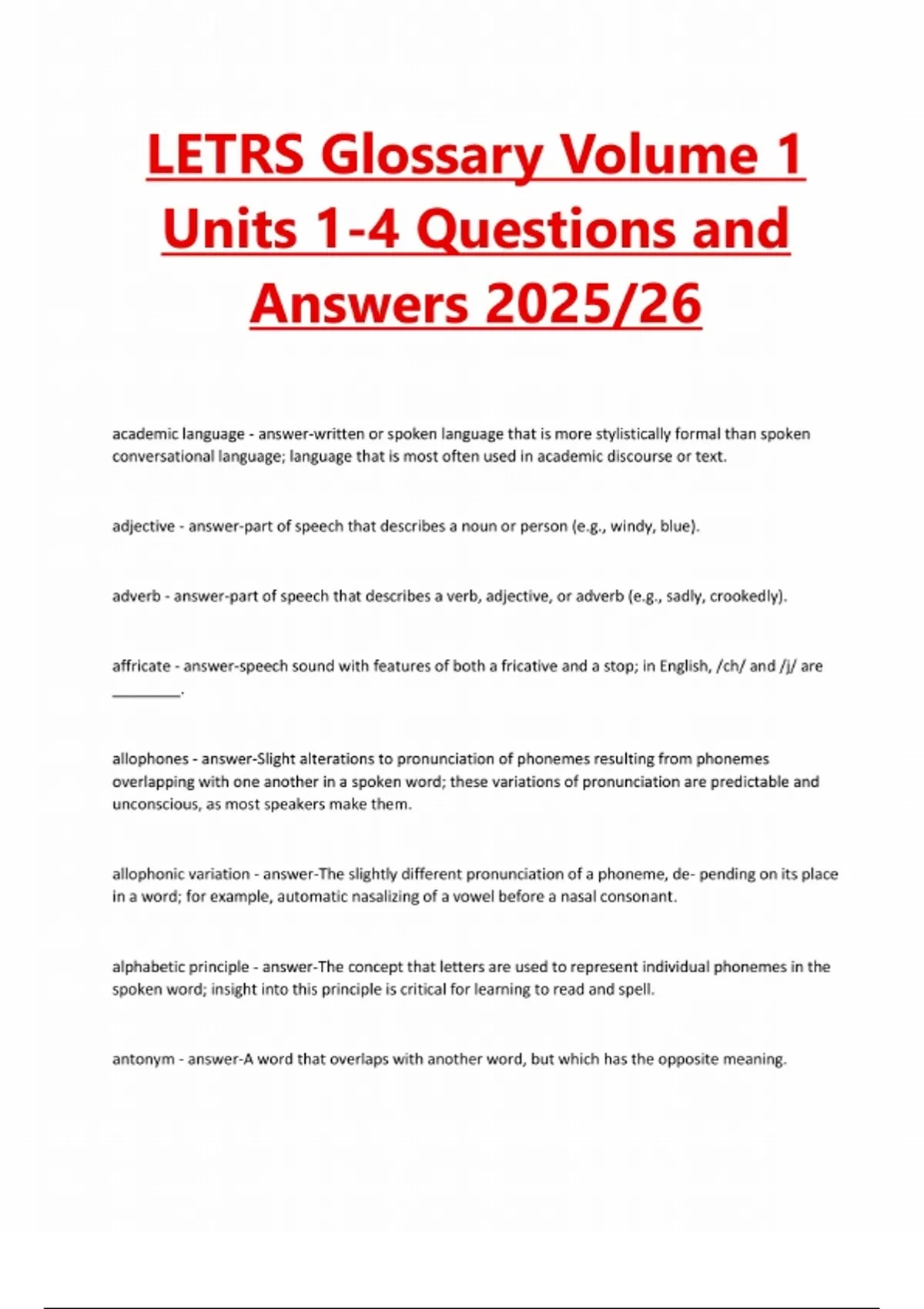 LETRS Glossary Volume 1 Units 1-4 Questions and Answers 2025/26