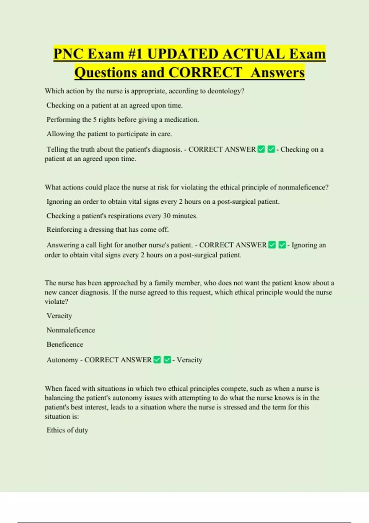PNC Exam #1 UPDATED ACTUAL Exam Questions and CORRECT Answers Which action by the nurse is appropriate, according to deontology? Checking on a patient at an agreed upon time. Performing the 5 rights before giving a medication. Allowing the patient to participate in care. Telling the truth about the patient's diagnosis. - CORRECT ANSWER patient at an agreed upon time. - Checking on a What actions could place the nurse at risk for violating the ethical principle of nonmaleficence? Ignoring an order to obtain vital signs every 2 hours on a post-surgical patie