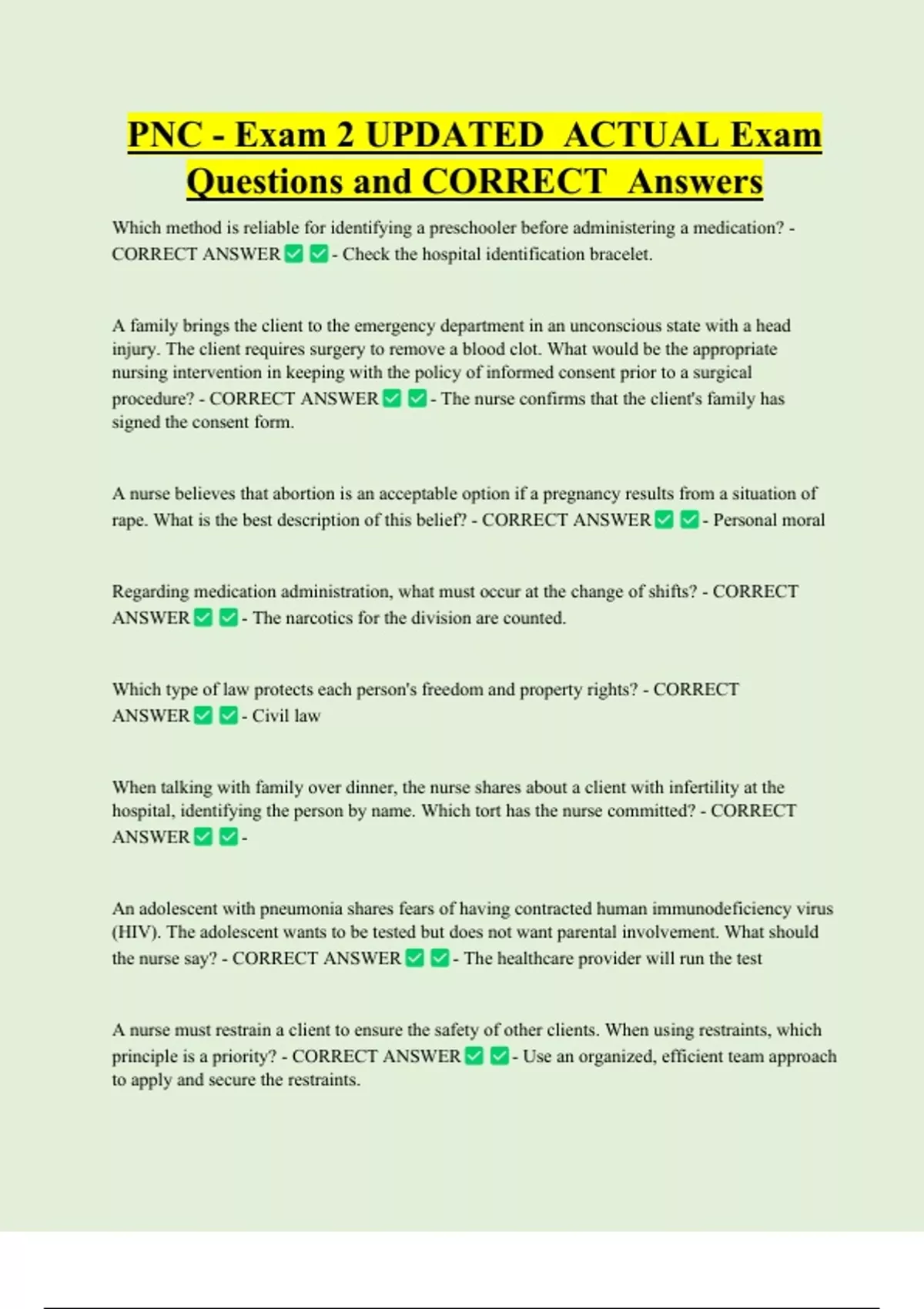 PNC - Exam 2 UPDATED ACTUAL Exam Questions and CORRECT Answers Which method is reliable for identifying a preschooler before administering a medication? - CORRECT ANSWER - Check the hospital identification bracelet. A family brings the client to the emergency department in an unconscious state with a head injury. The client requires surgery to remove a blood clot. What would be the appropriate nursing intervention in keeping with the policy of informed consent prior to a surgical procedure? - CORRECT ANSWER - The nurse confirms that the client's family has signed the consent fo